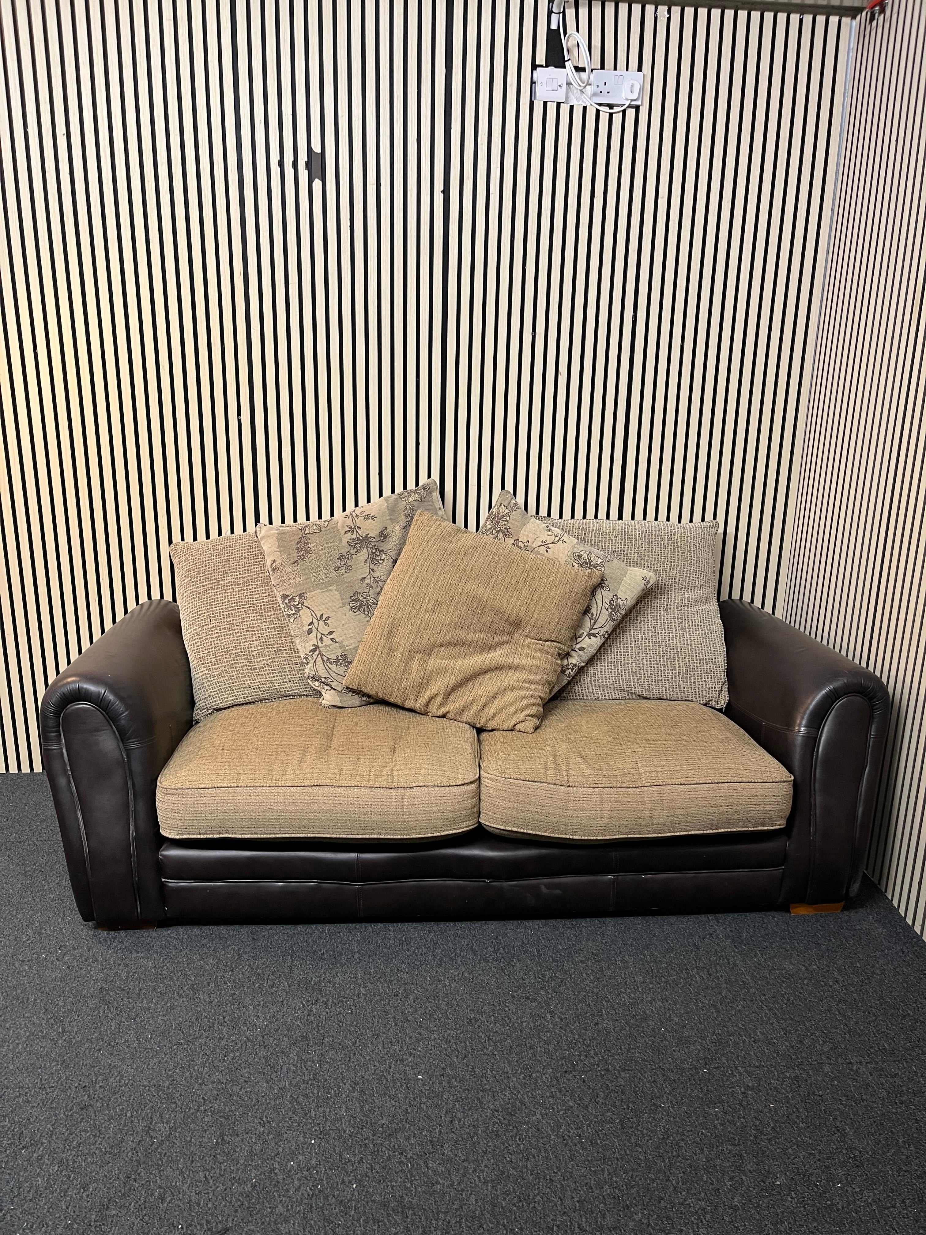 2 Seater sofa brown leatherette framed, brown mix fabric cushions