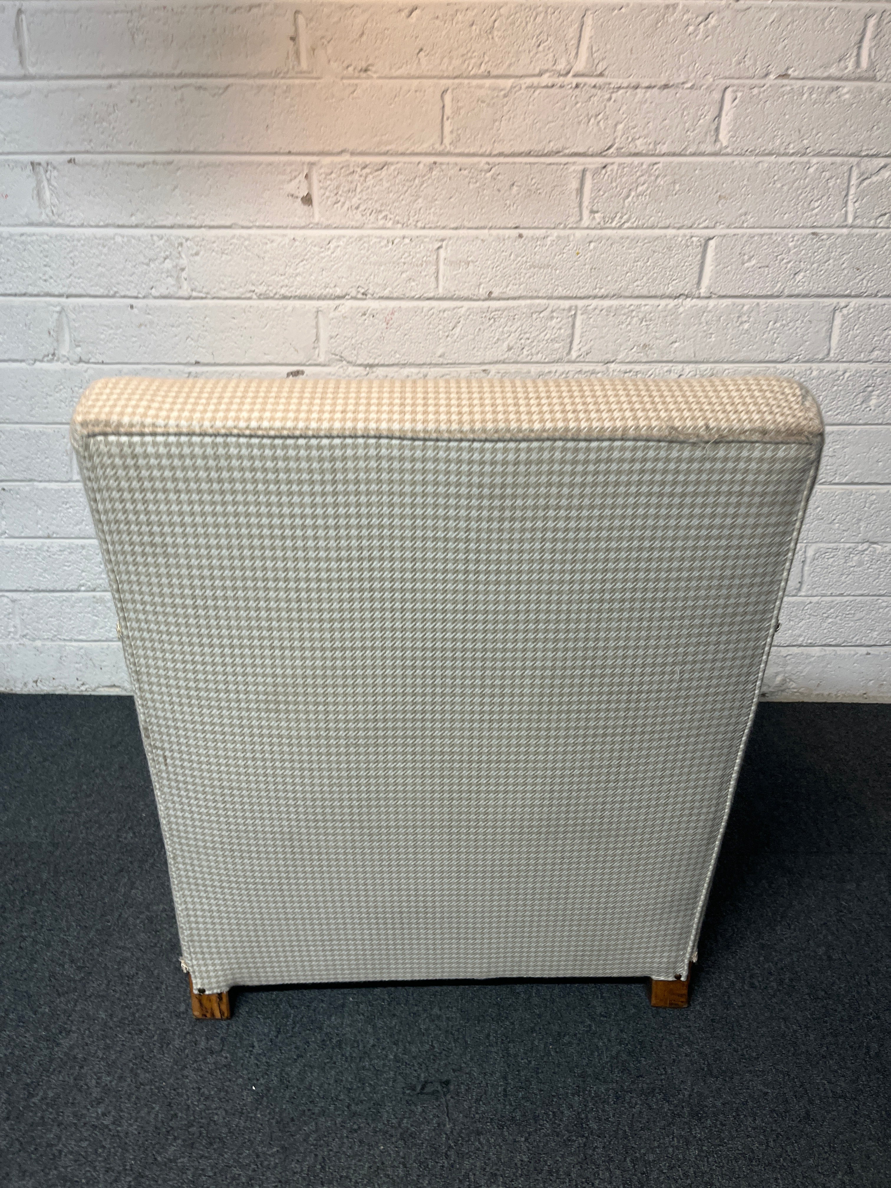 - Share: Antique solid oak framed ornate carved detail wing back armchair with cream chequered fabric 2225
