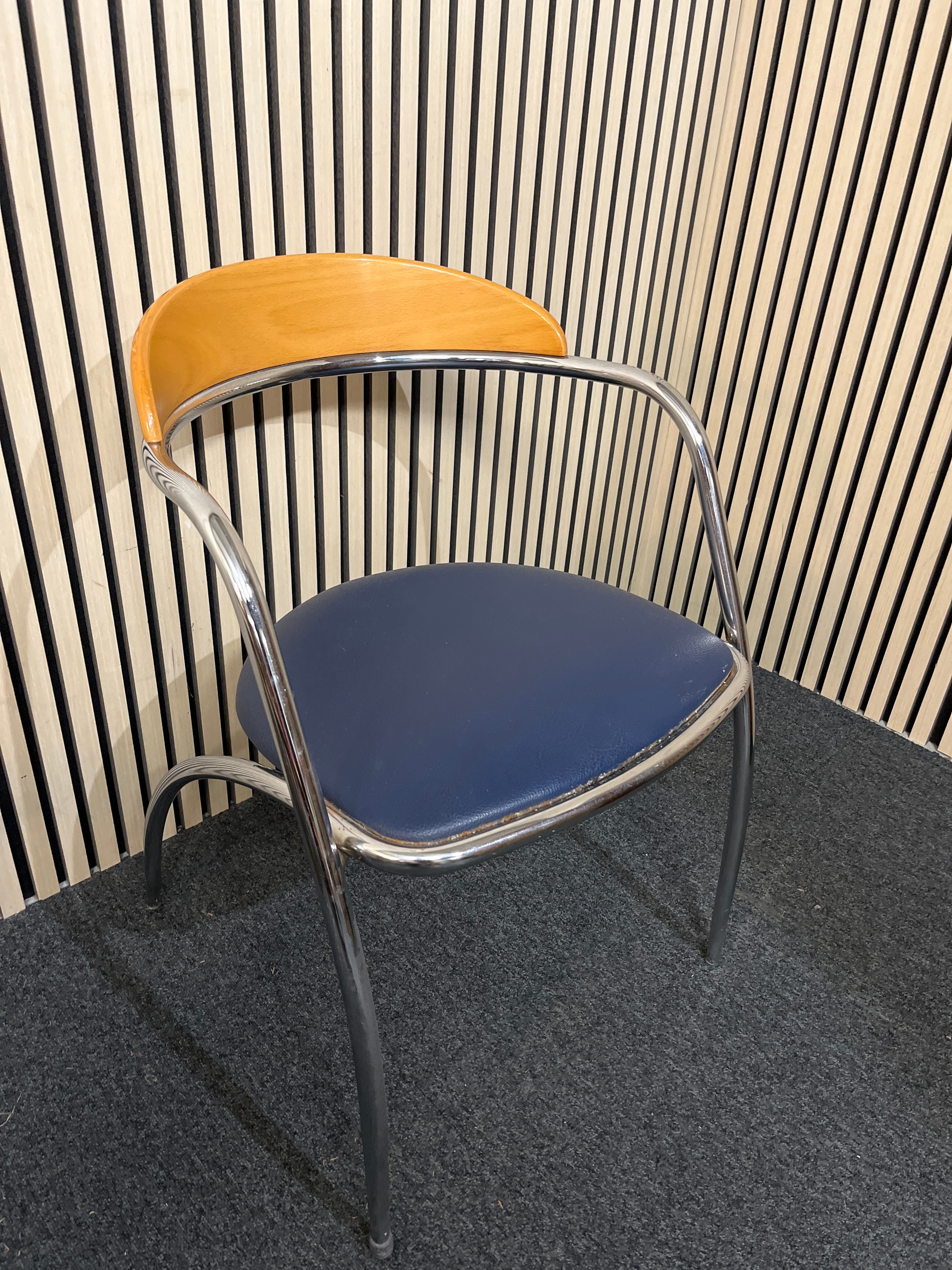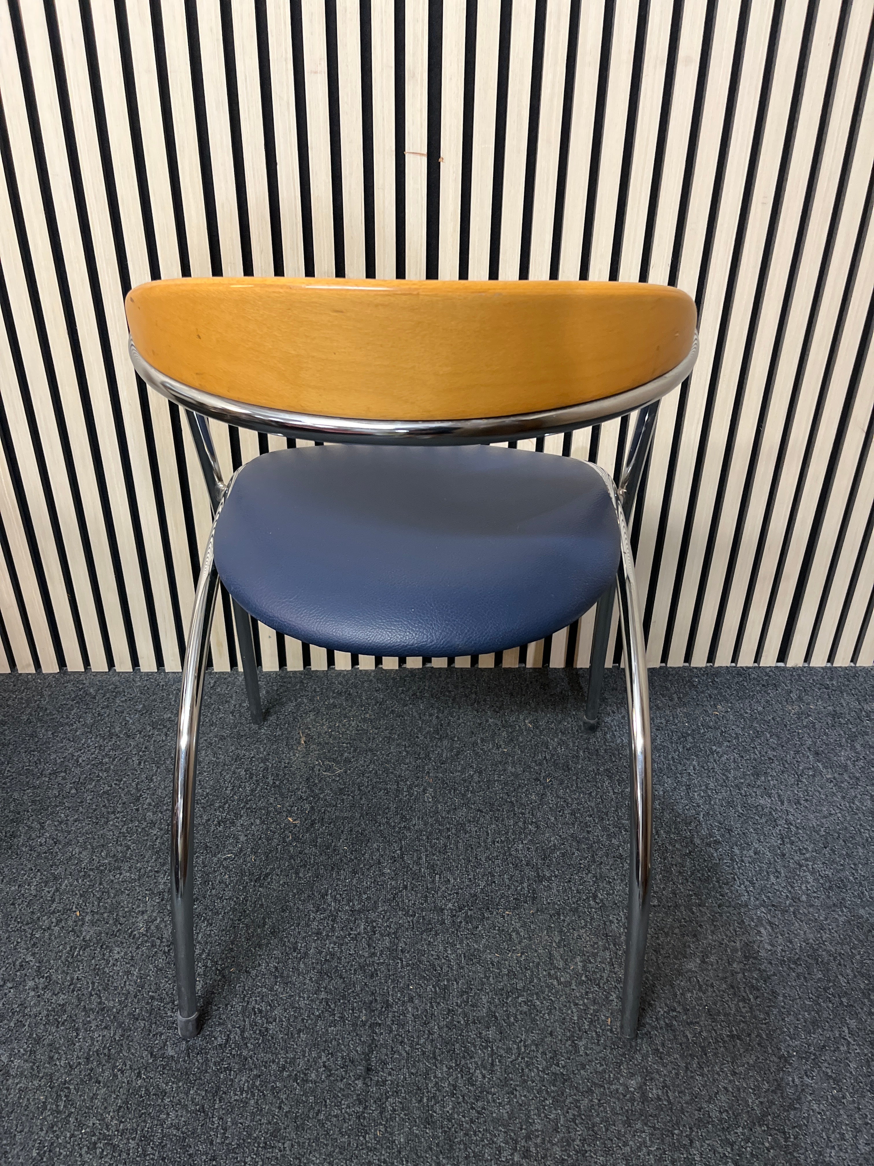 Chrome framed, beech curved back, navy vinyl seat fabric stacking chair
