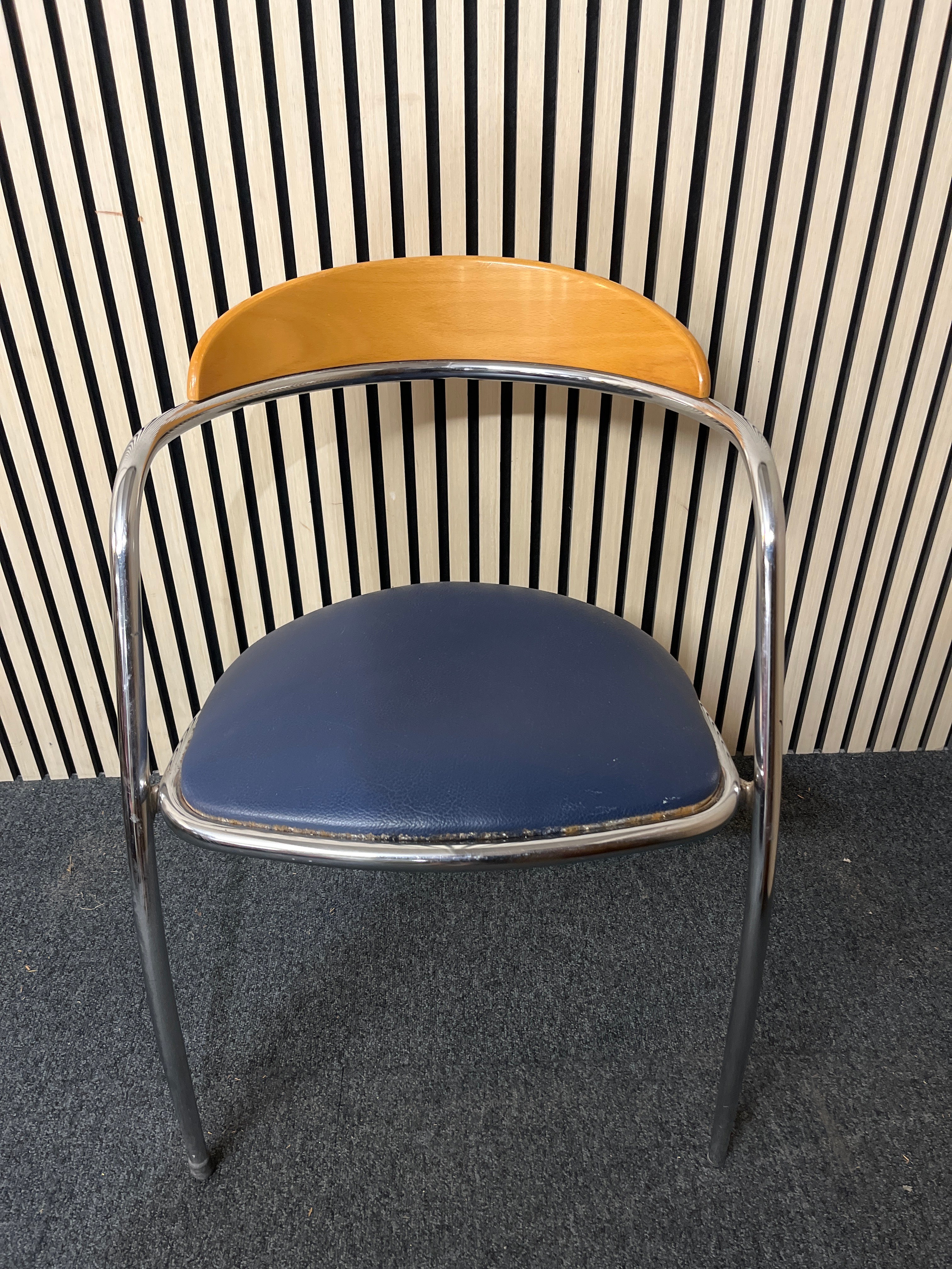 Chrome framed, beech curved back, navy vinyl seat fabric stacking chair 1425