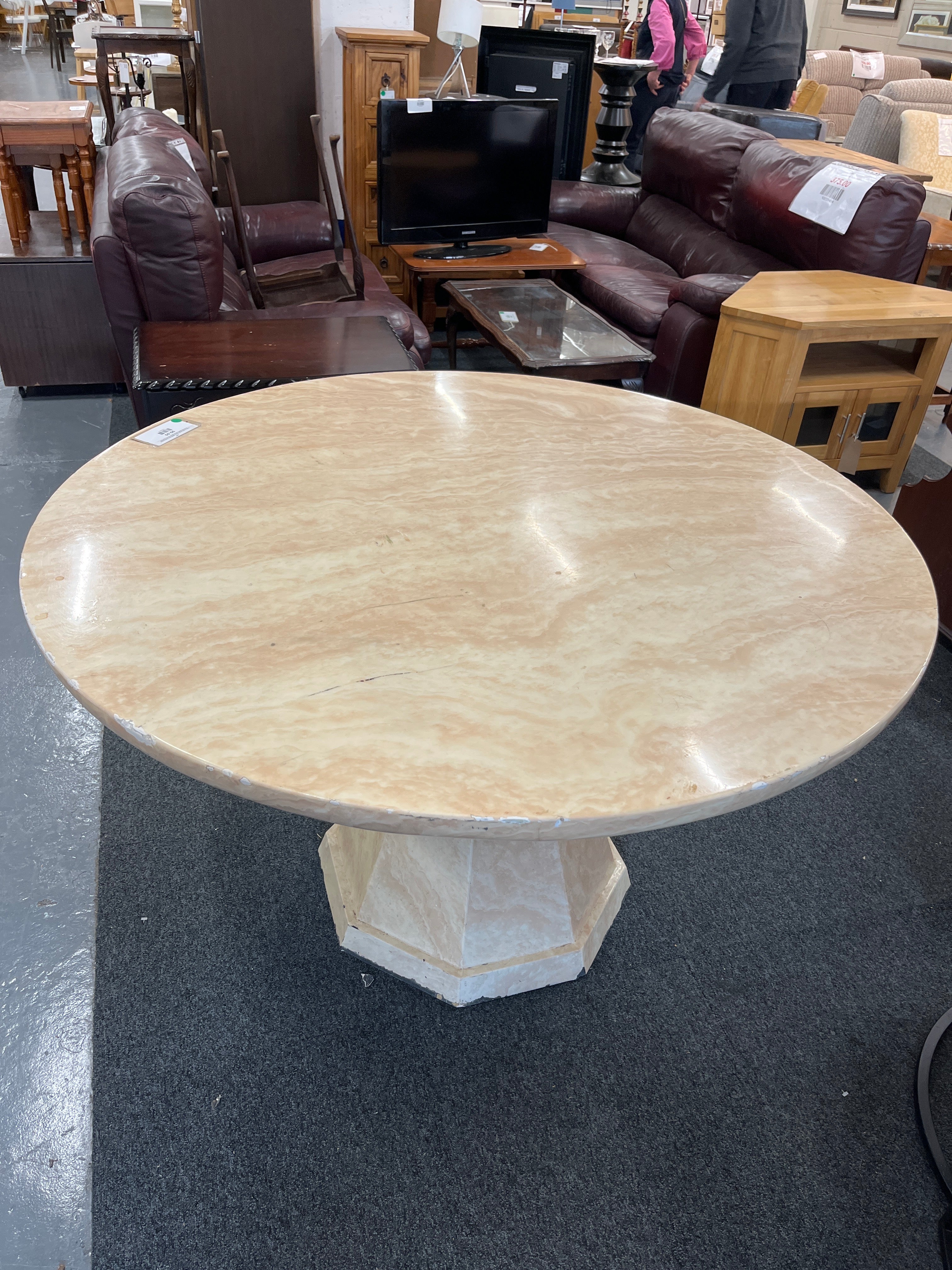 Cream marble effect circular 1300Wx760H central podium base dining table, note damage to parts of edge