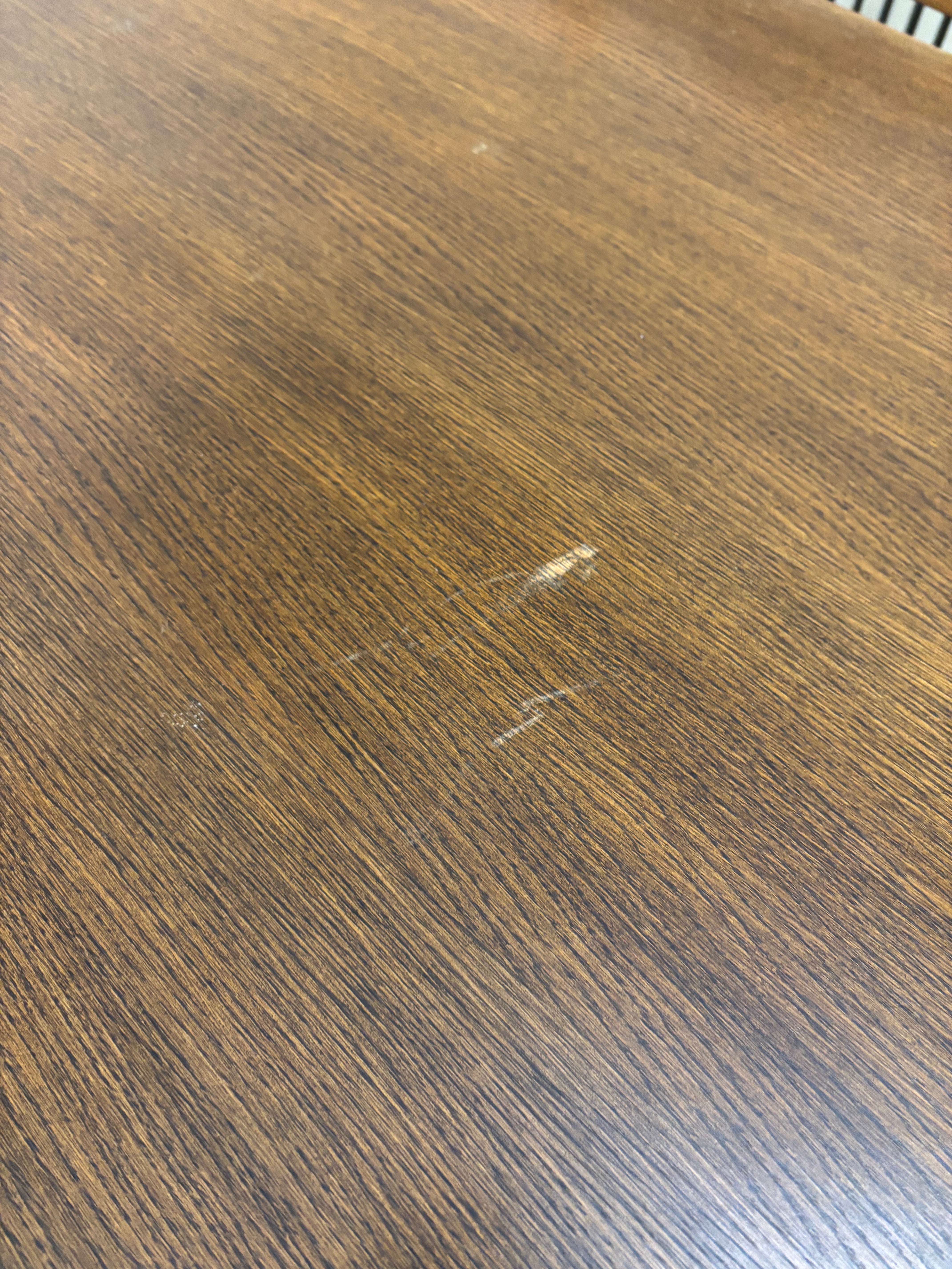 - Share: Dutch dark oak stained large rectangular kitchen table with 6 no. matching chairs with fabric seat 2425