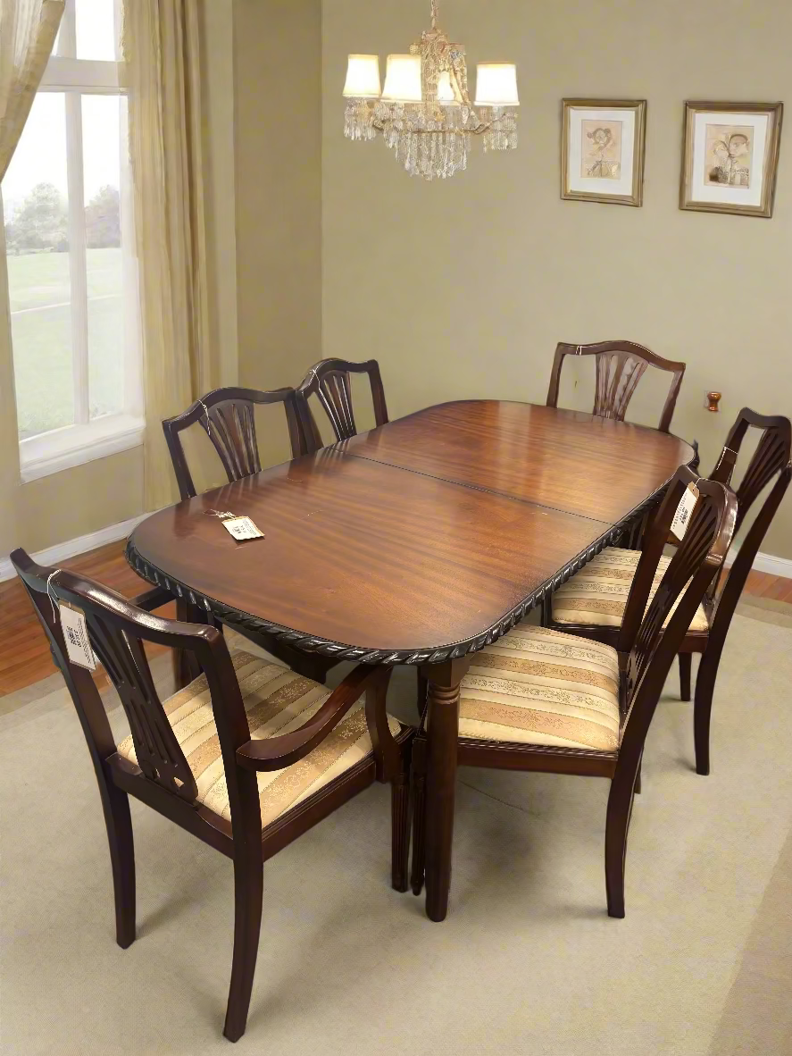 Extendable Mahogany 1525L (5ft) x 880W (not extended) rossmore dining table with 4 no. dining chairs with stripe fabric seat and 2 no. carver archairs 2225