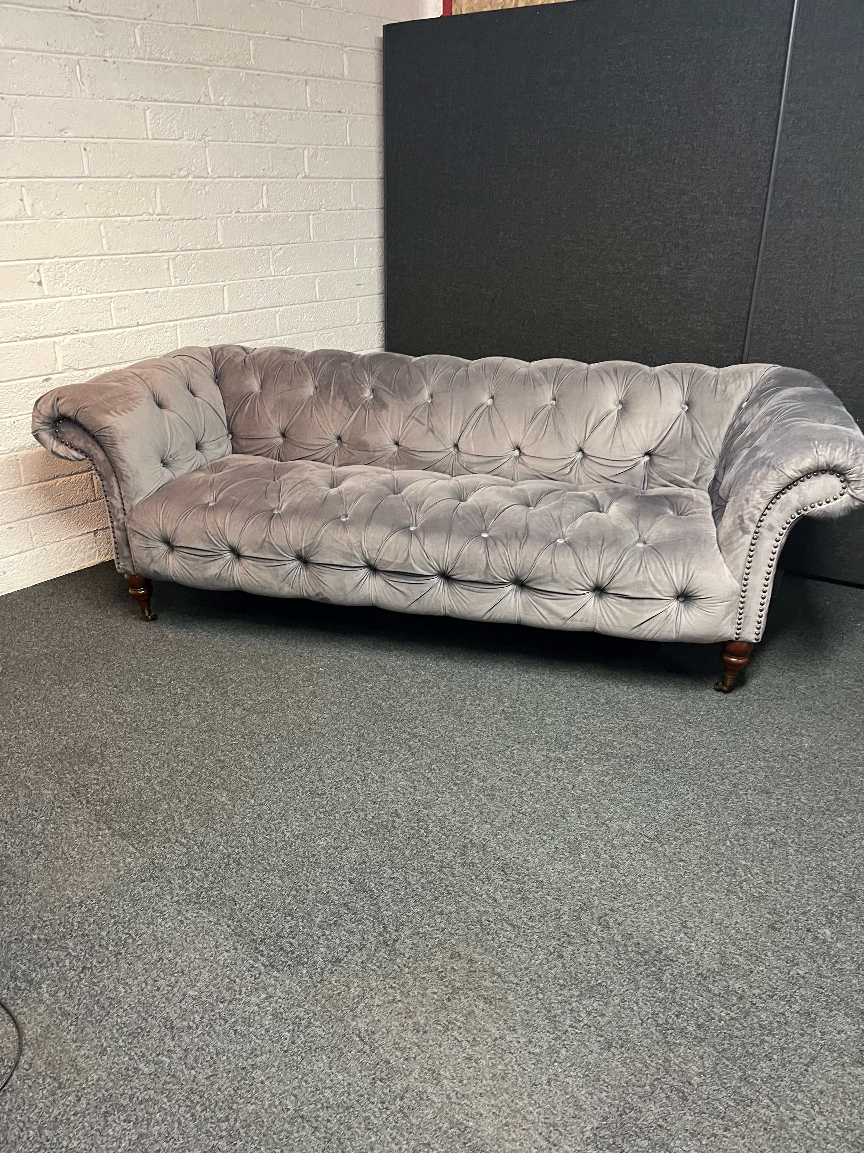 - Share: Large 3 seater grey velour button back chesterfield sofa with mahogany leg frame 2225