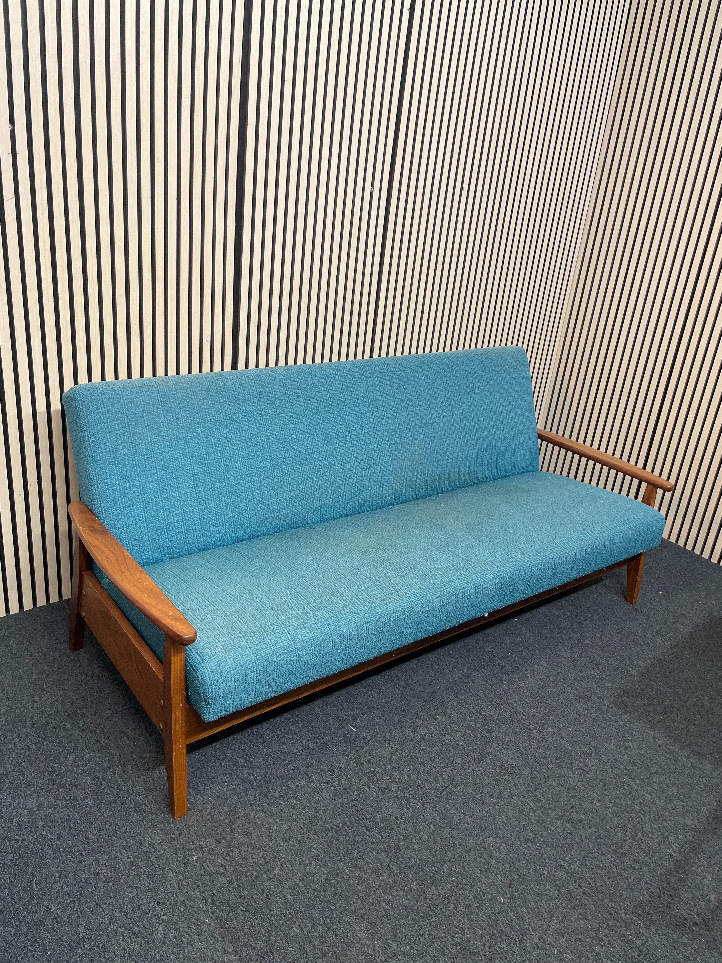 Large 3 seater teal fabric, solid dark wood frame sofa bed