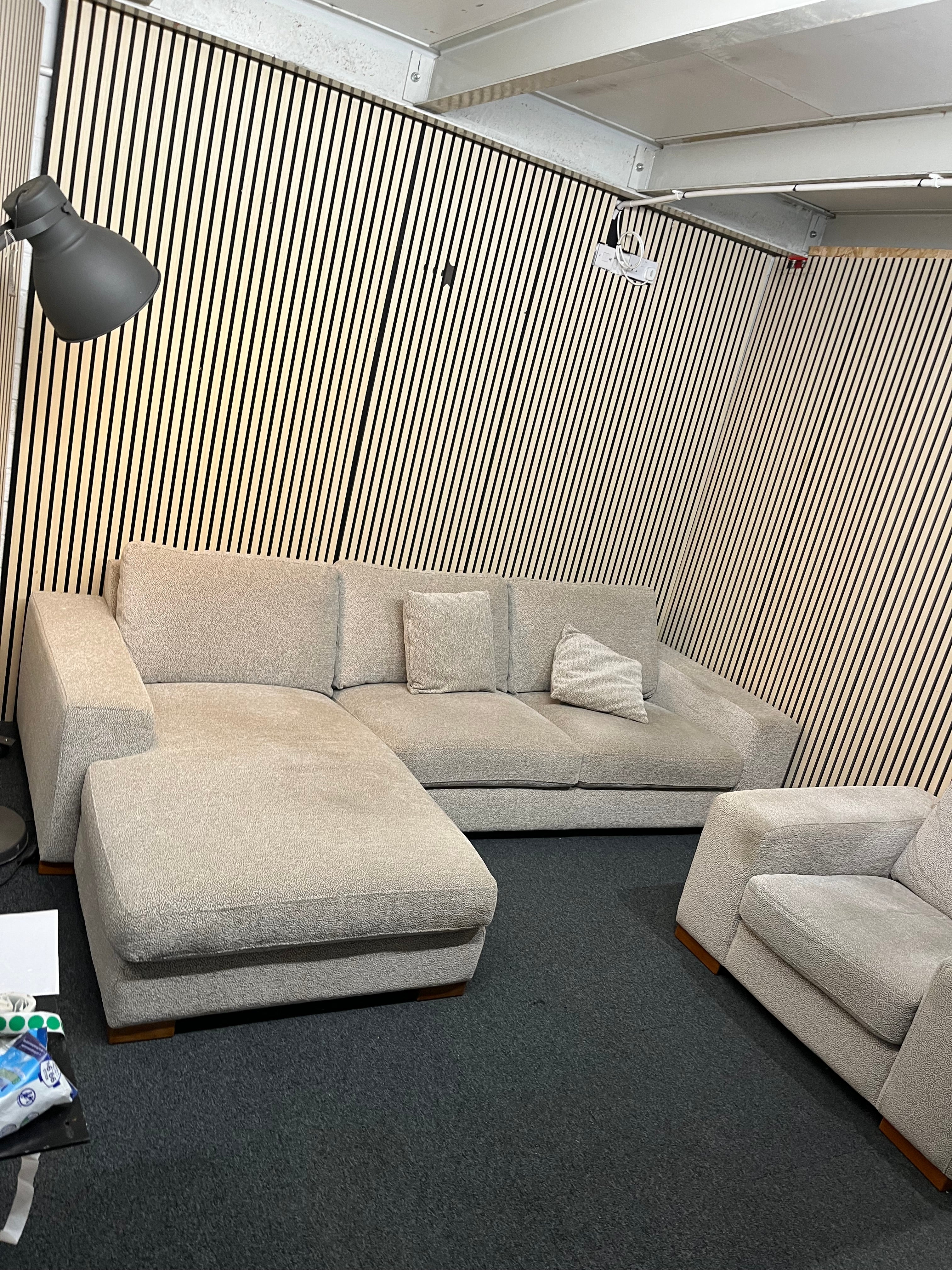 Large right hand light cream fabric corner sofa suite with matching armchair (Width 290 cm, depth 170cm and 100 cm)