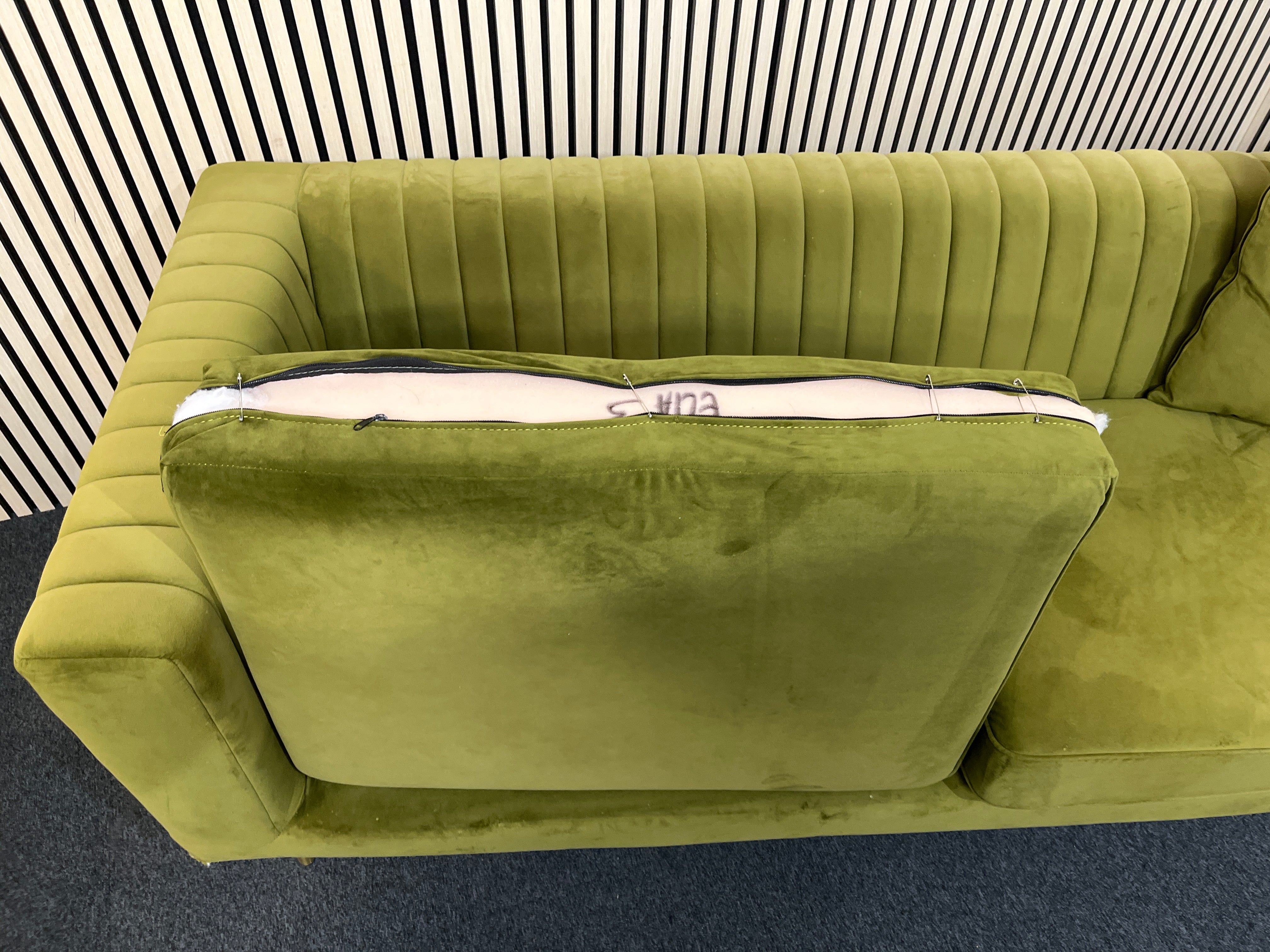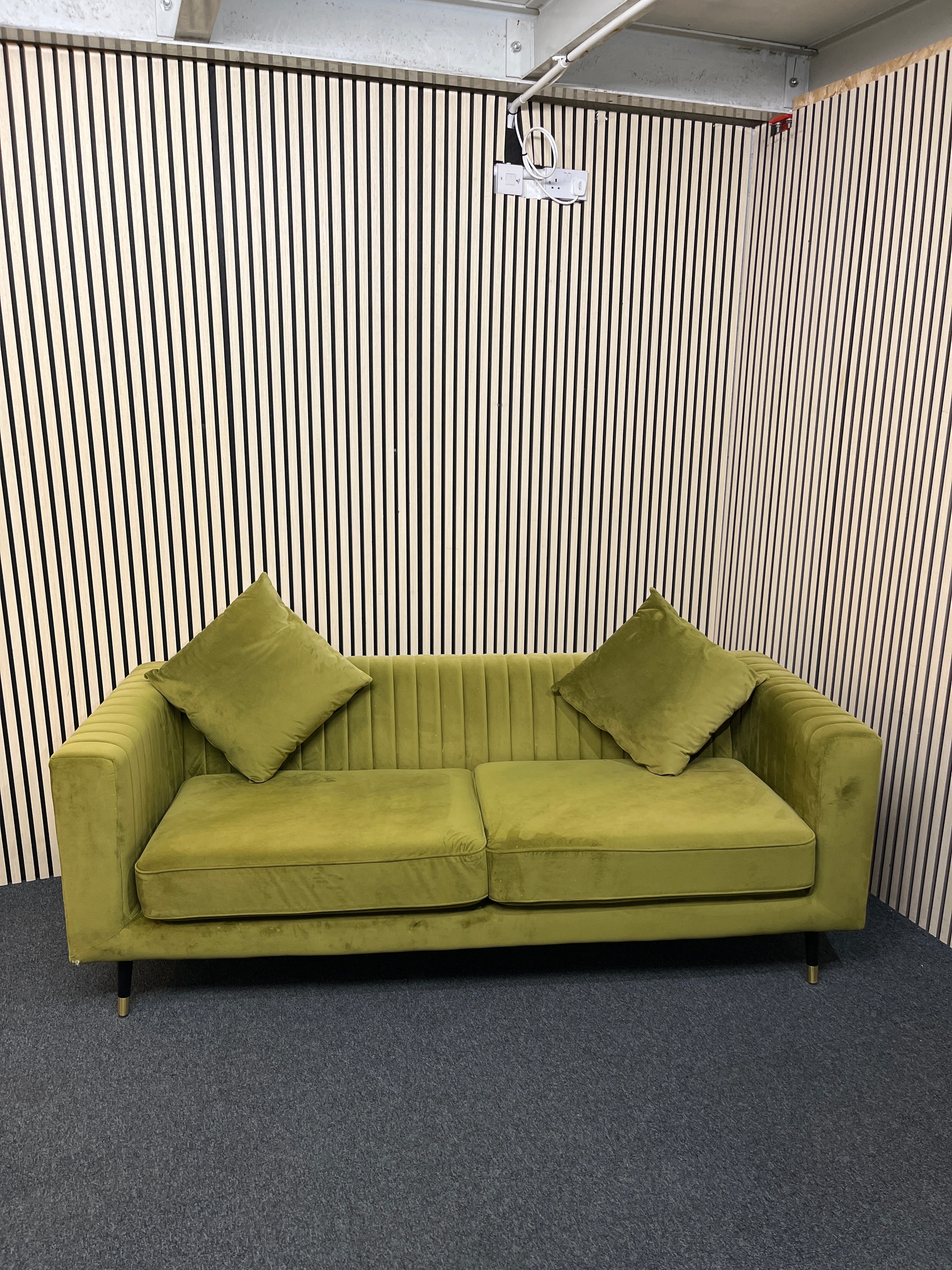 Modern olive green velvet sofa with vertical channel tufting, 2 seat cushions and slim black legs assencted with gold tips( W x 197 L x 81 H x 73 cm). NOTE DAMAGE TO BOTTOM LEFT OF SOFA. ZIP BROKEN ON RHS BACK OF CUSHION