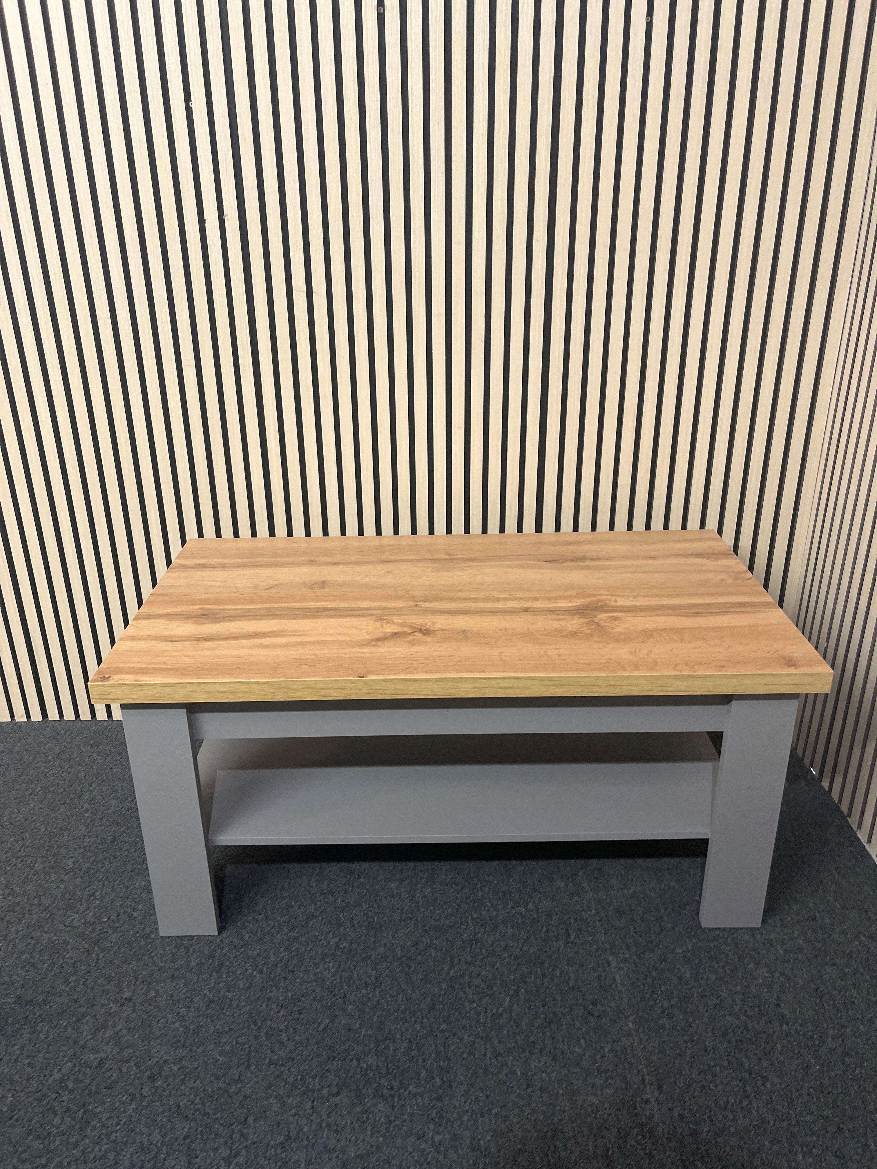 Oak and grey laminate rectangular coffee table with shelf
