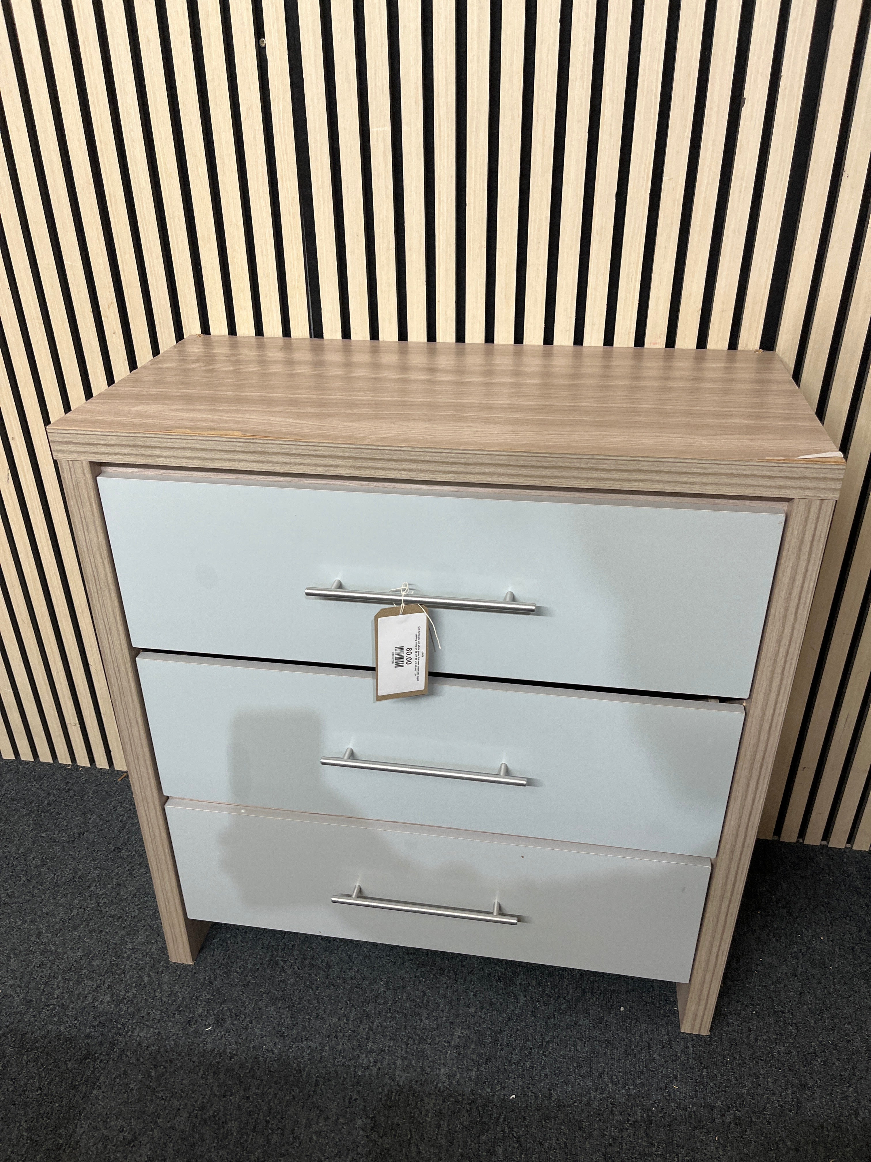 Oak laminate and white gloss 3 drawer chest with slight peeling to top (H 86 x W 80 x D 40 cm) 1126