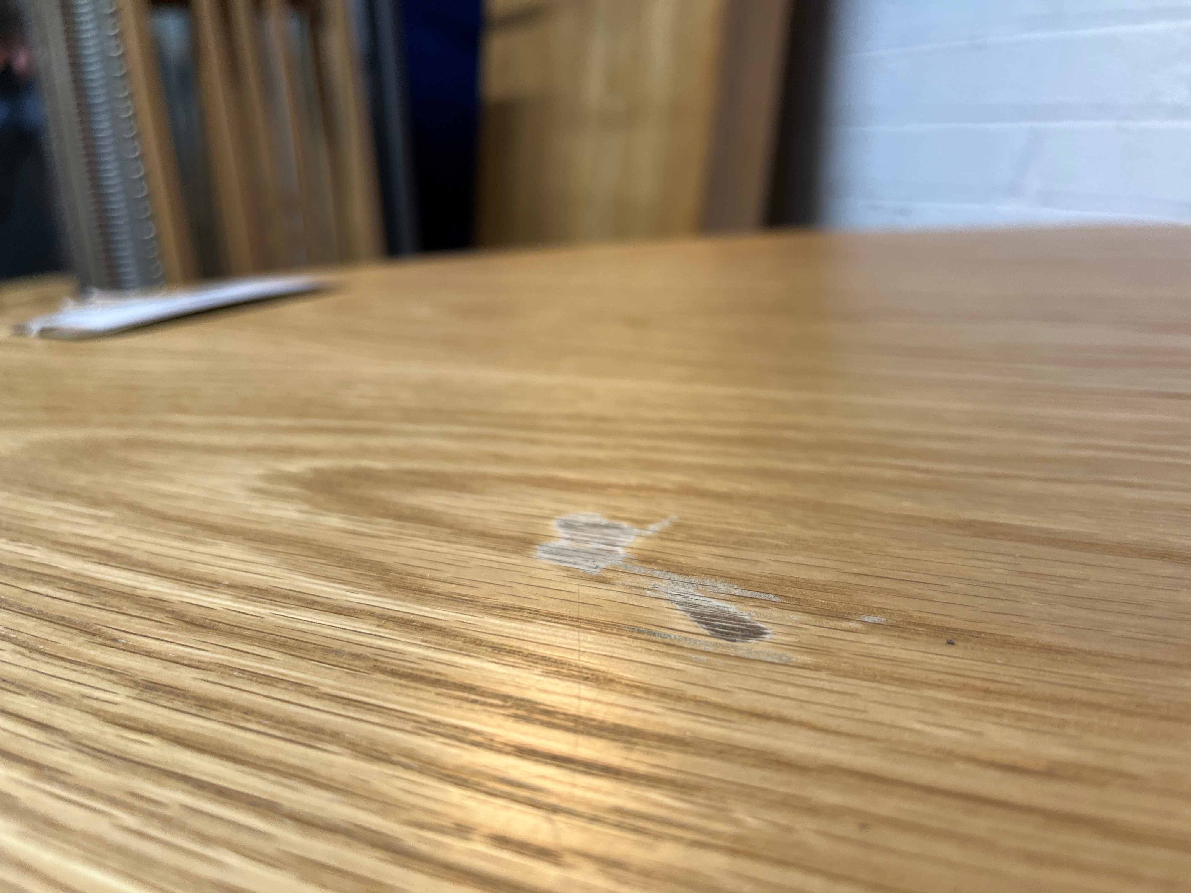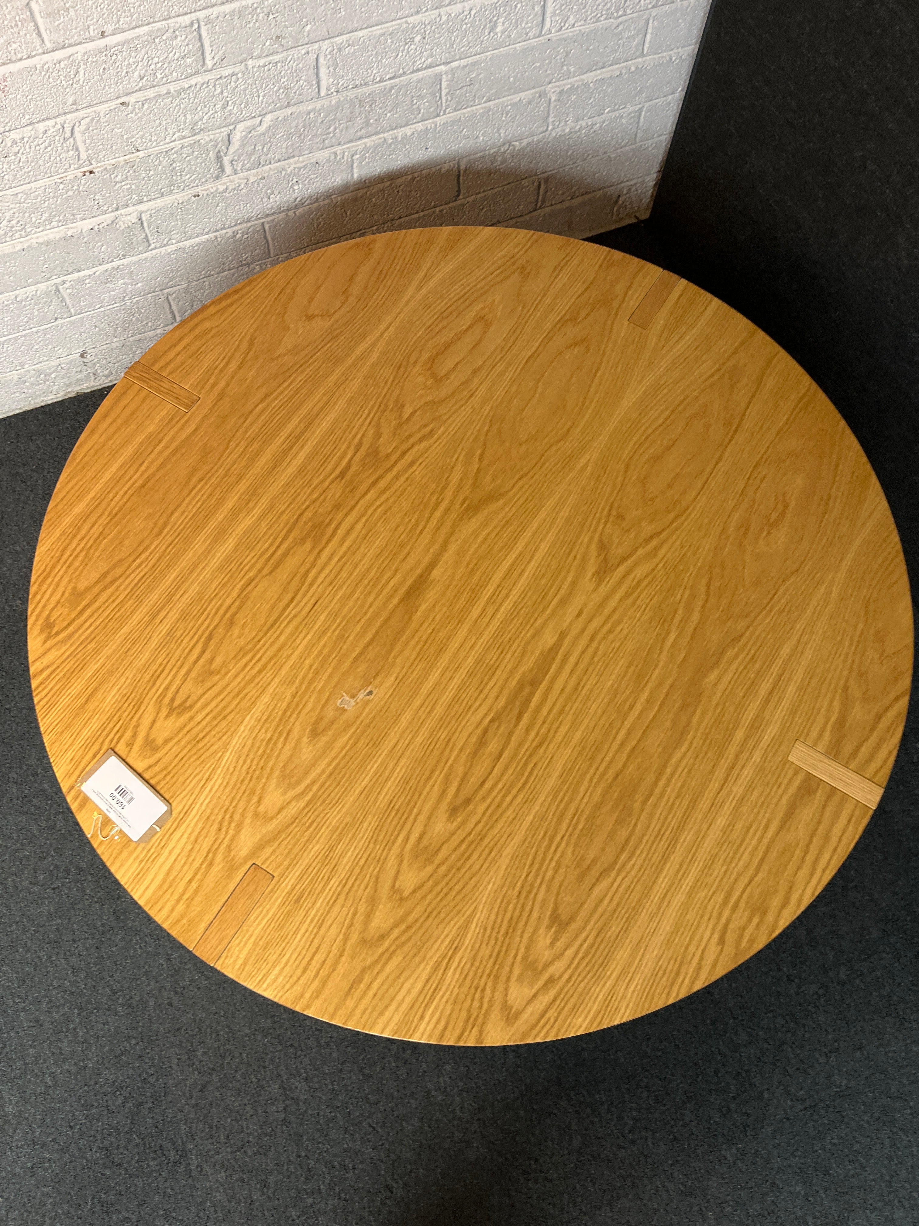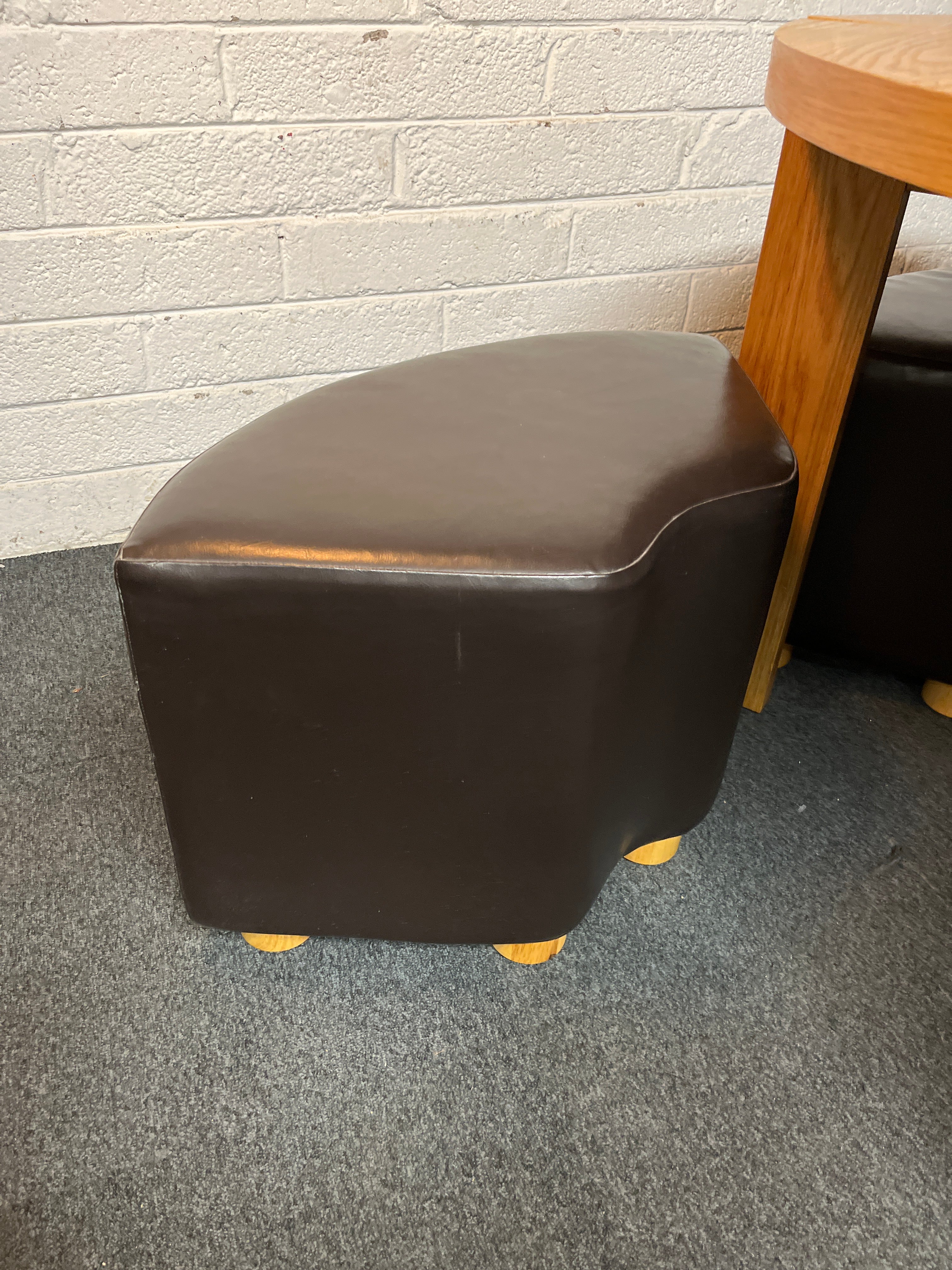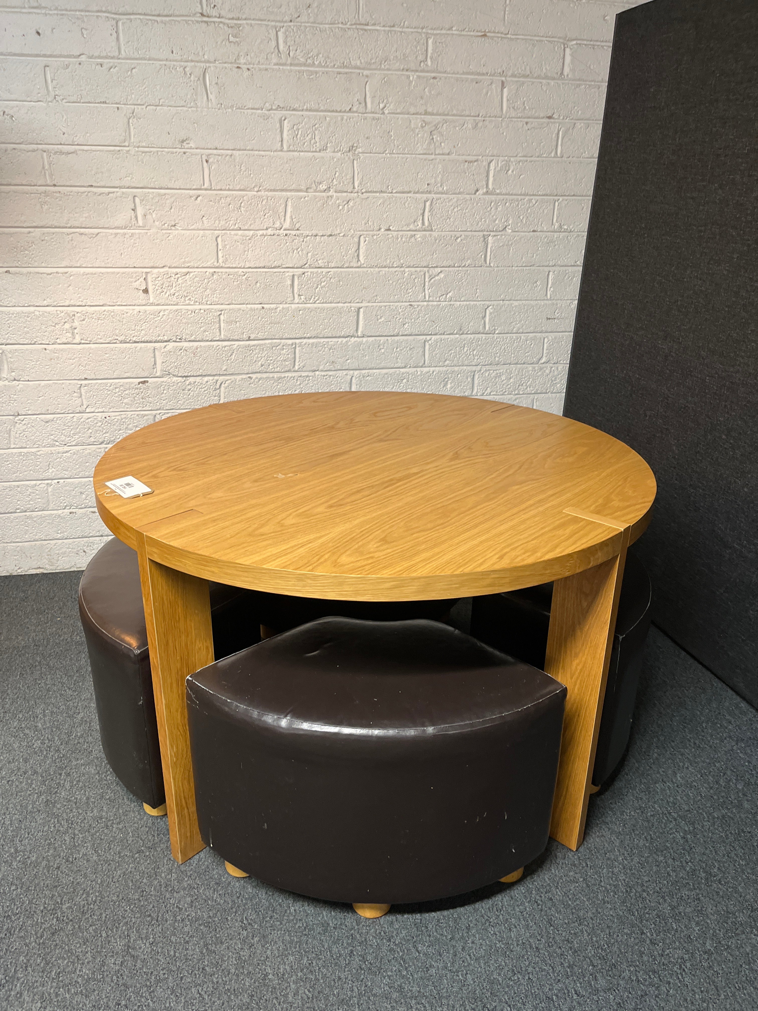 - Share: Oak veneer small circular table (120 cm diameter) with 4 no. under table brown leatherette stools 2225