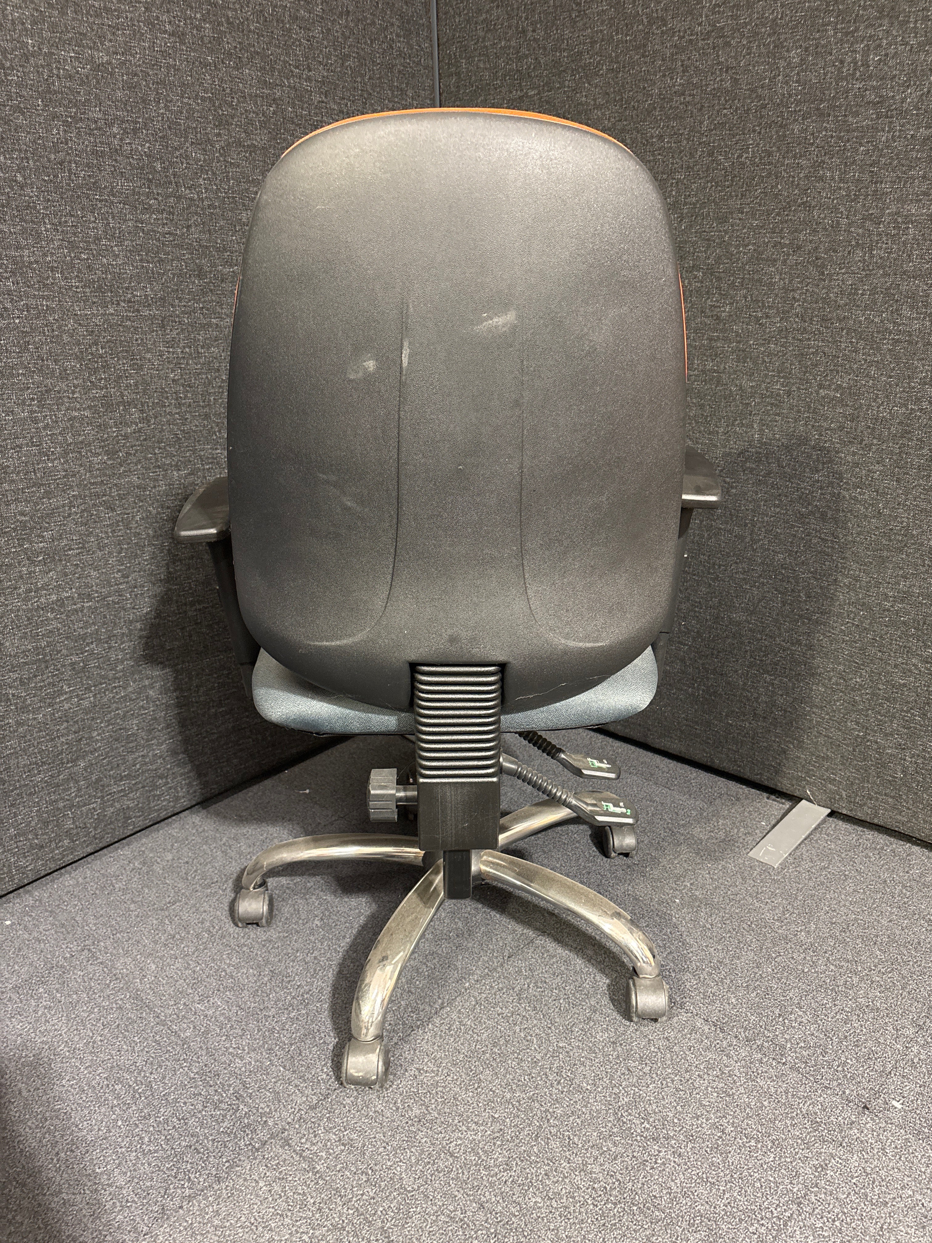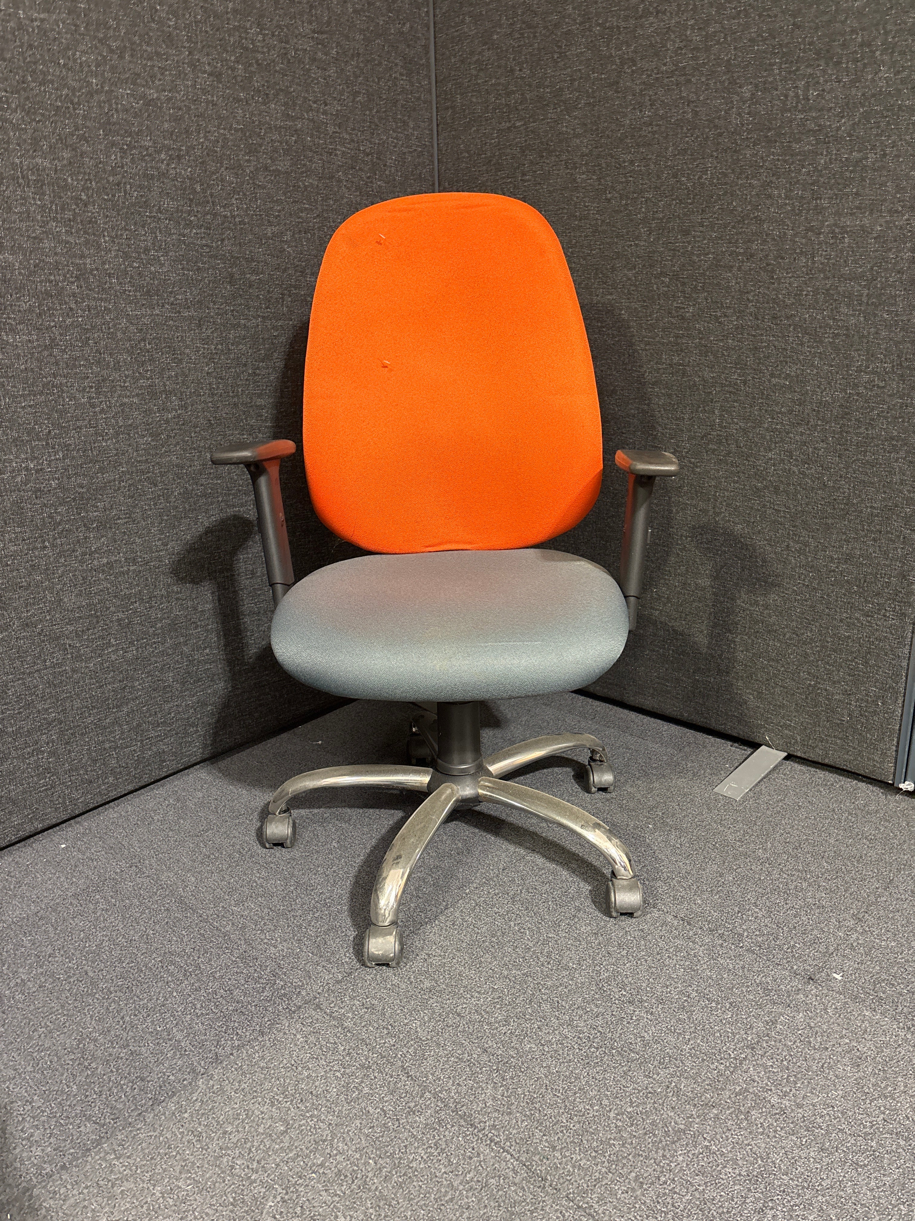 Two tone orange and grey high back swivel chair with height adjustable arms