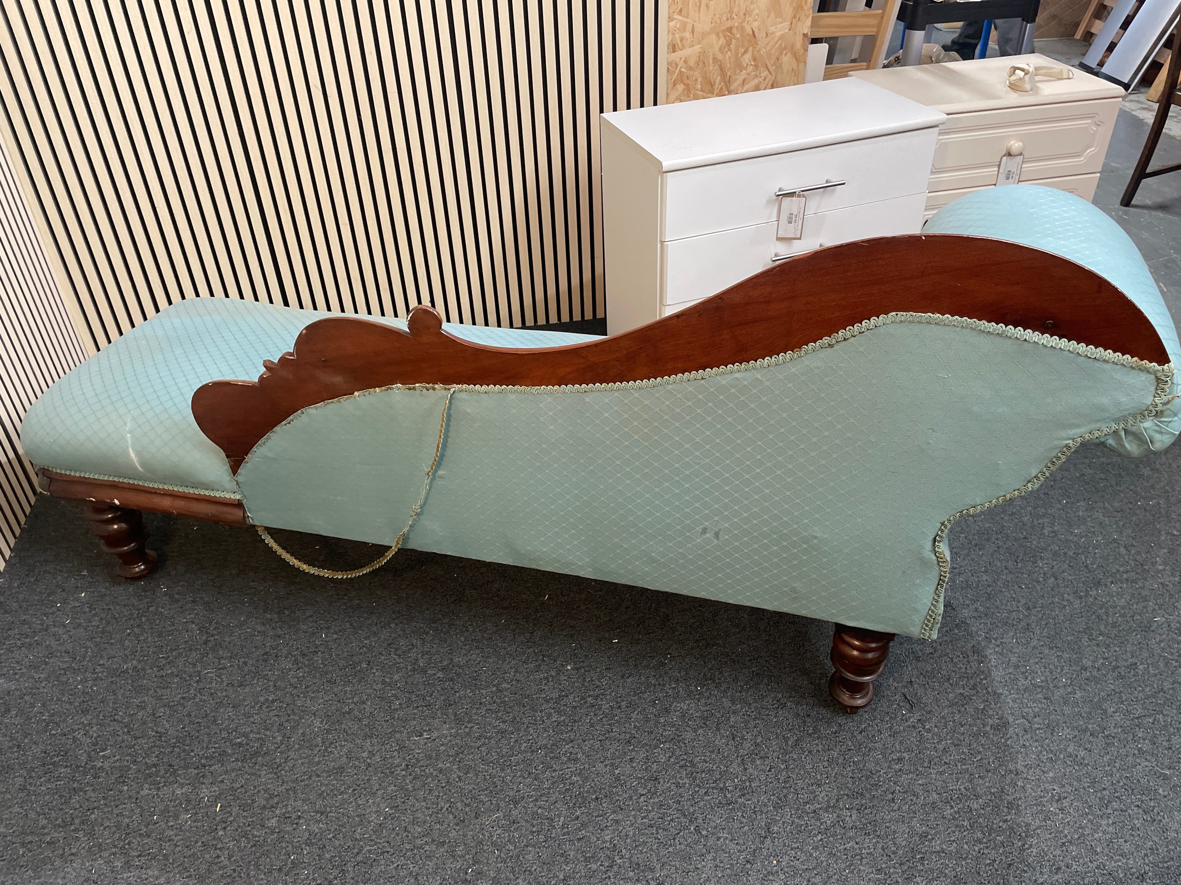 Ornate solid dark wood stained chaise lounge in green pastel fabric, ideal for upholstery