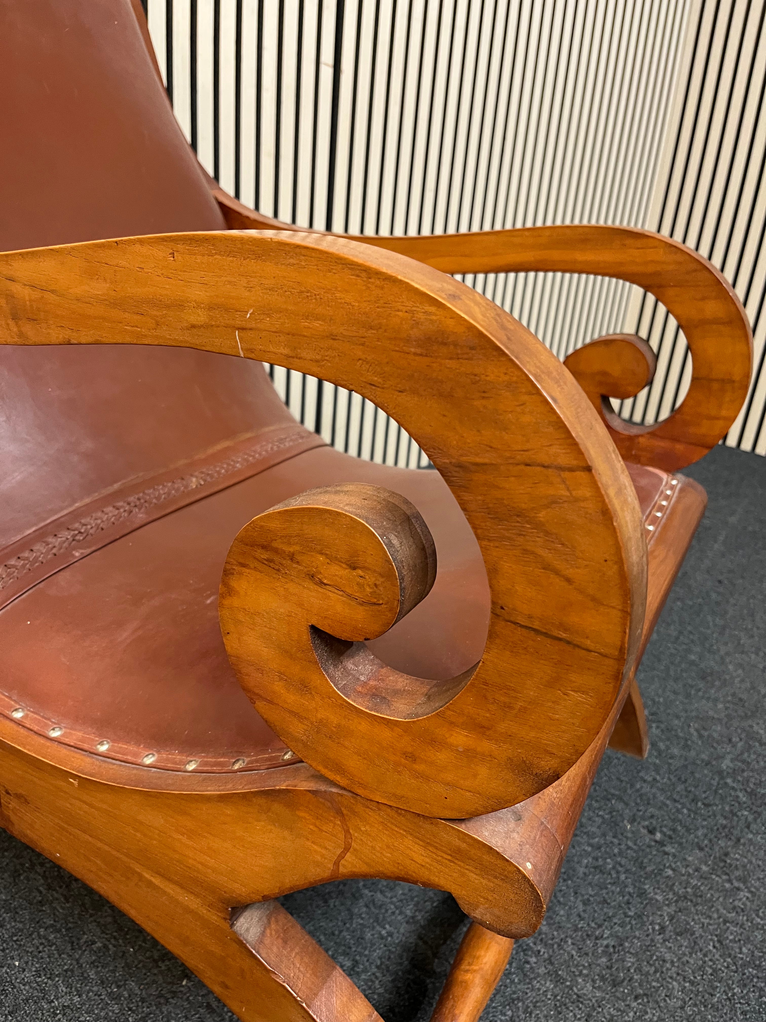 Ornate solid dark wood stained occasional armchair with brown leather studded seat