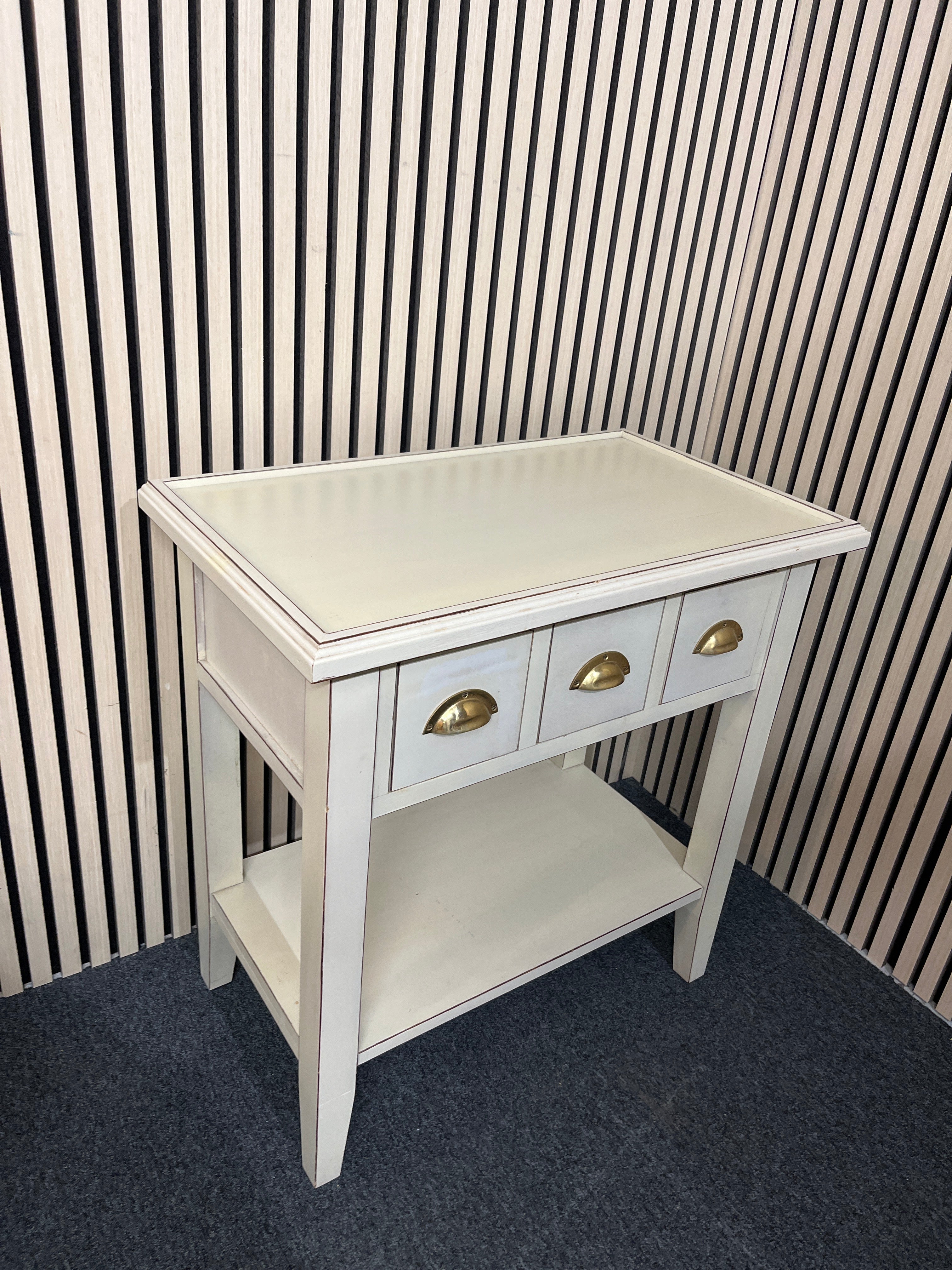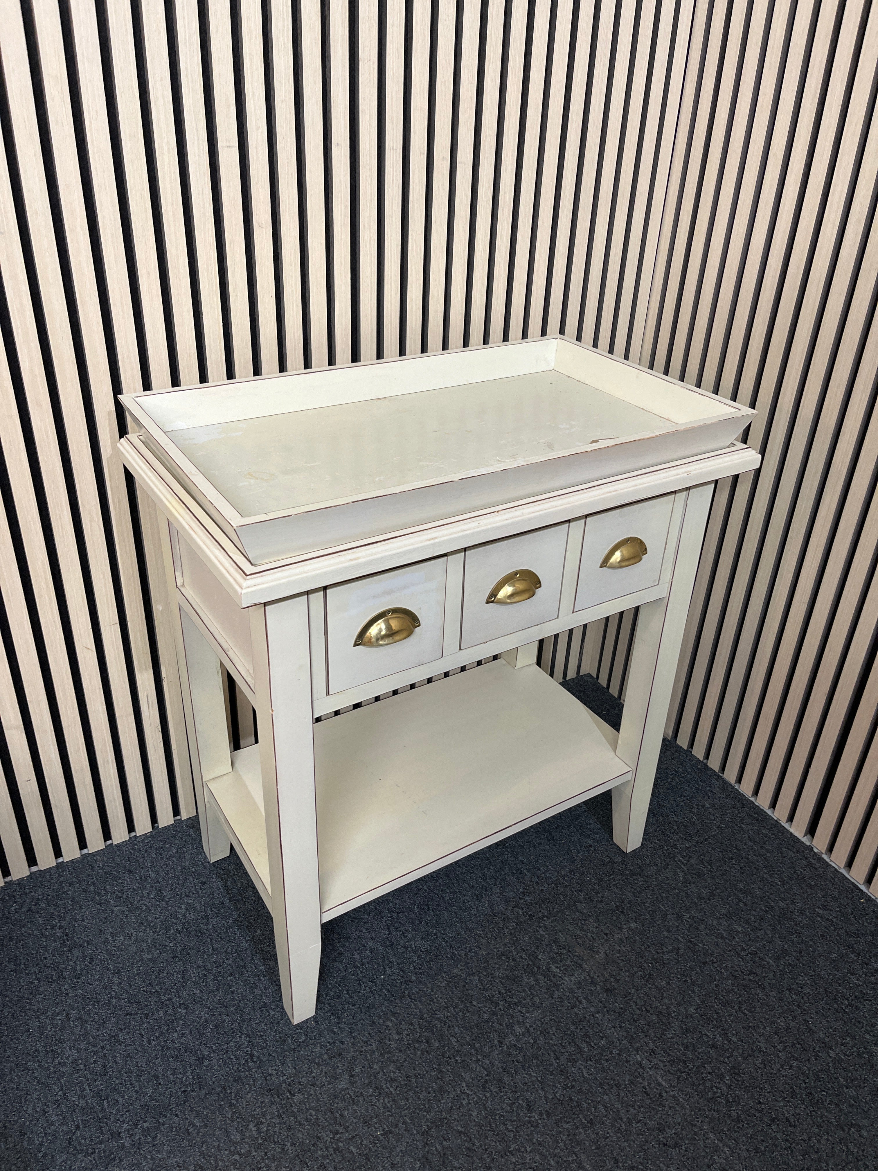 Palet green painted occasional console table with 3 drawers and removal tray top 82Hx75Wx43D