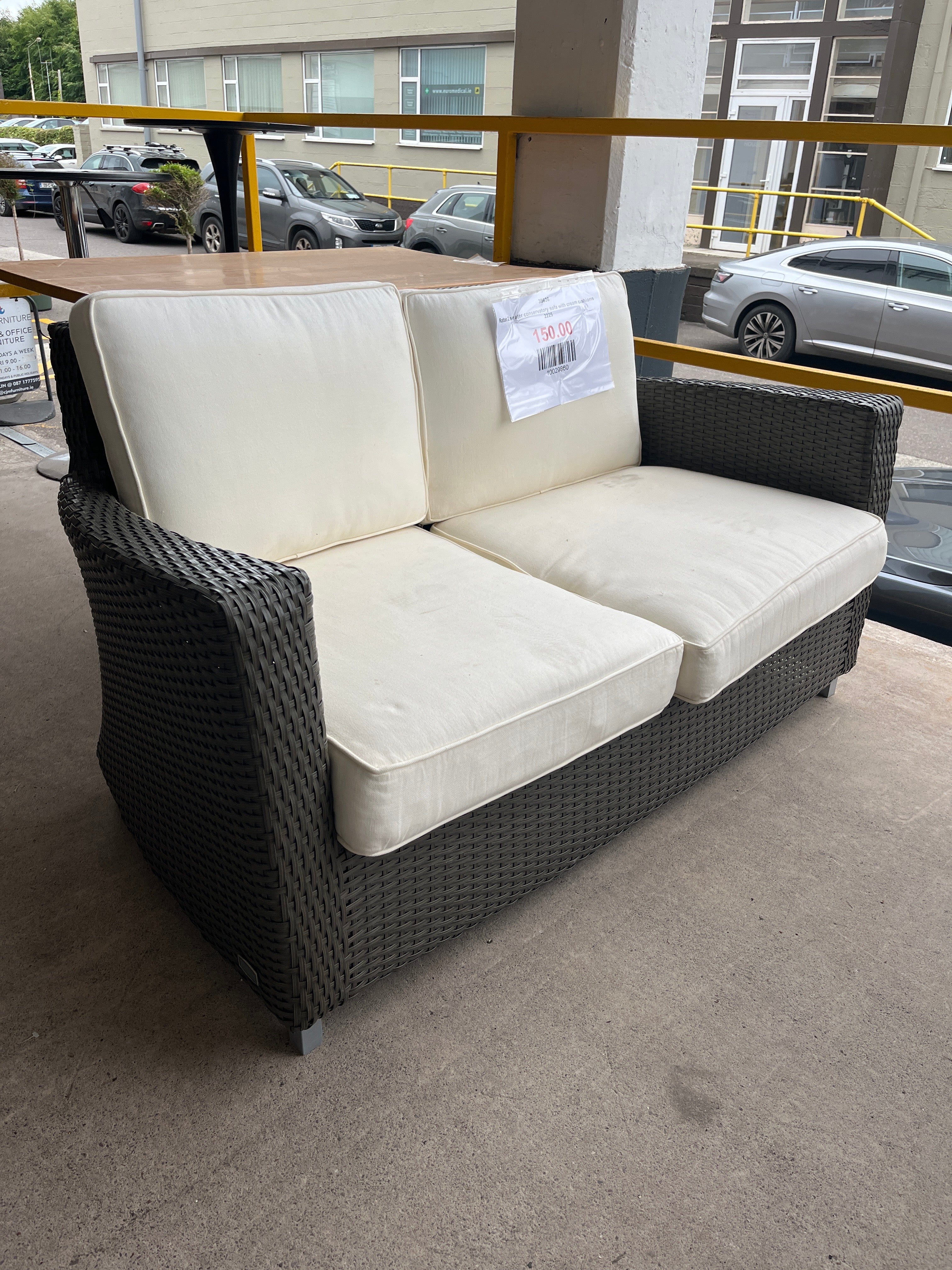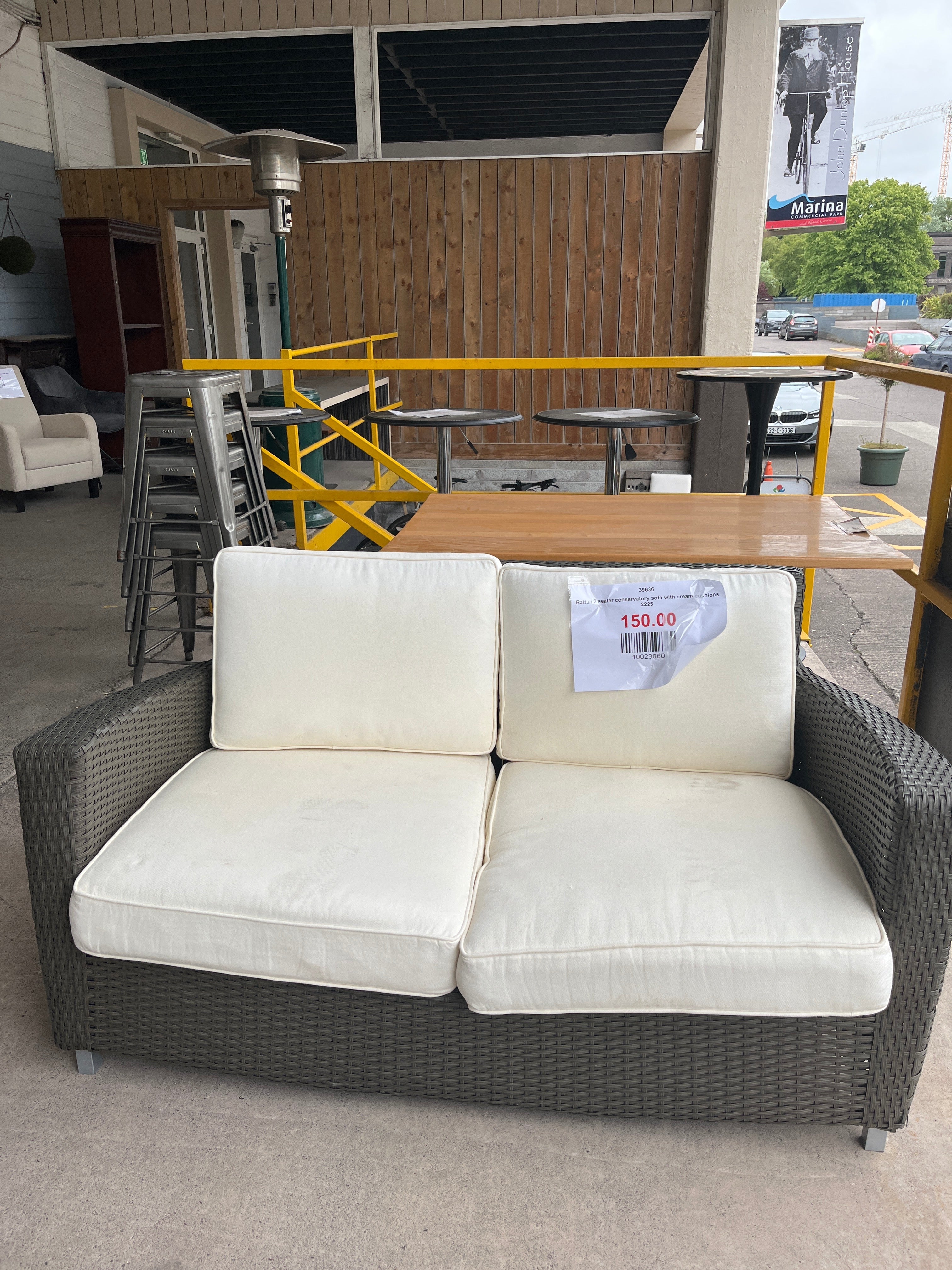 Rattan 2 seater conservatory sofa with cream cushions 2225