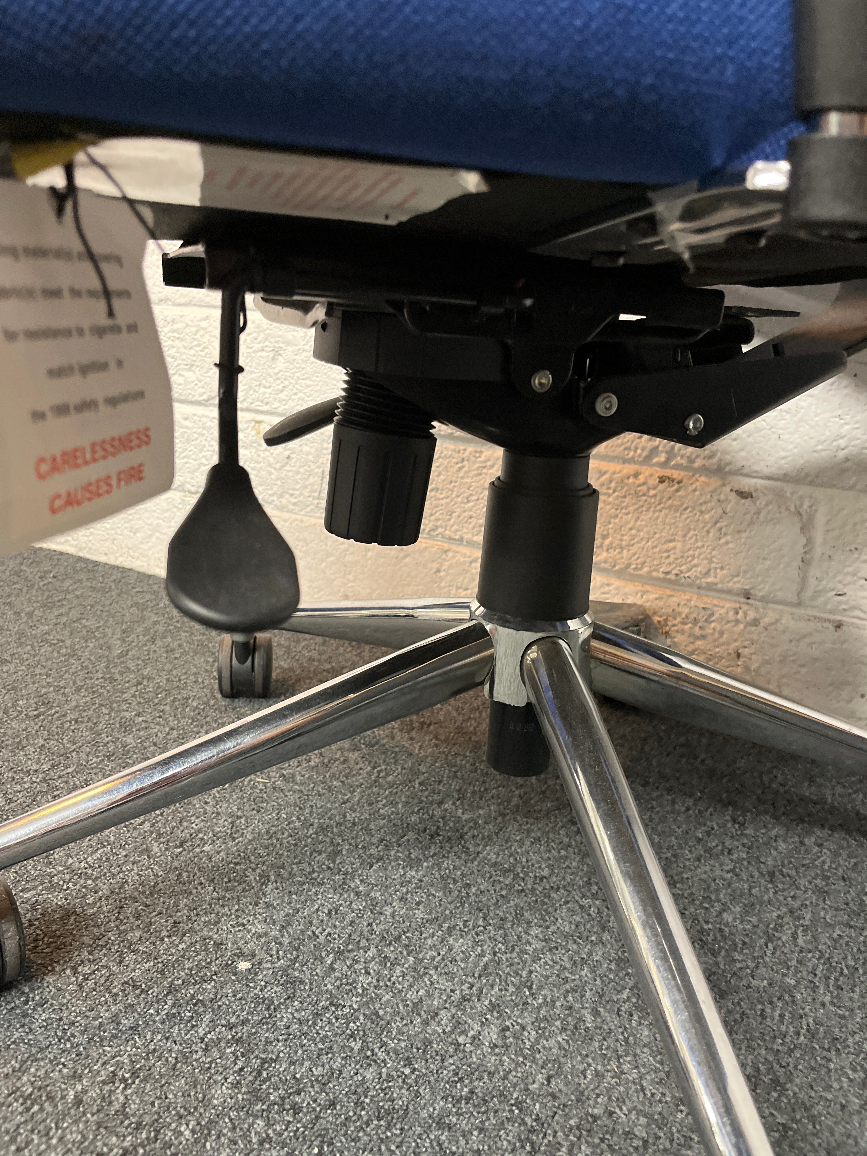 Share: Secondhand High back, dark blue fabric swivel chair, heavy duty with polished chrome base and height adjustable arms and back tensioner . PRICE INC VAT, 20+ IN STOCK