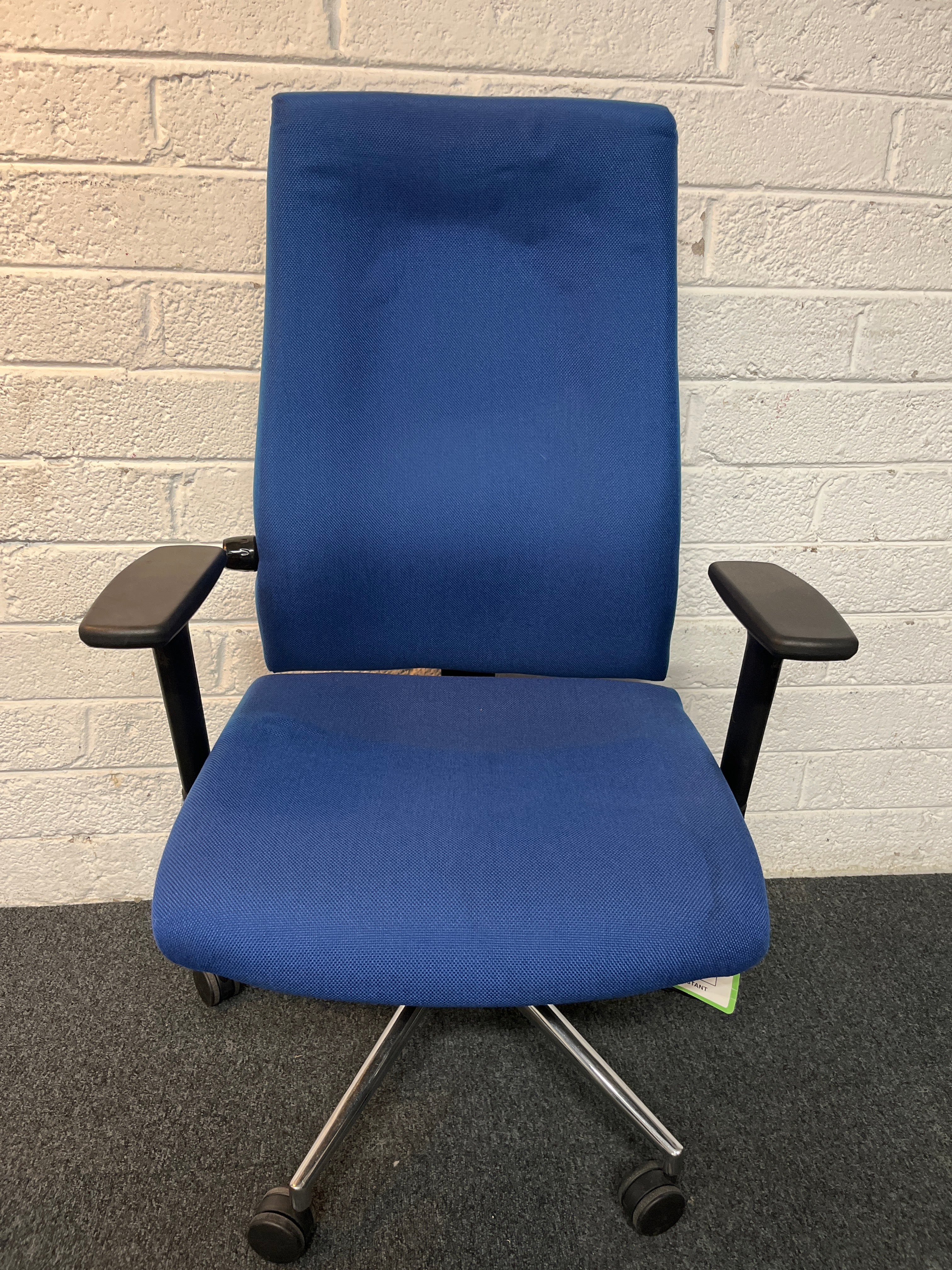 Secondhand High back, dark blue fabric swivel chair, heavy duty with polished chrome base and height adjustable arms and back tensioner . PRICE INC VAT, 20+ IN STOCK
