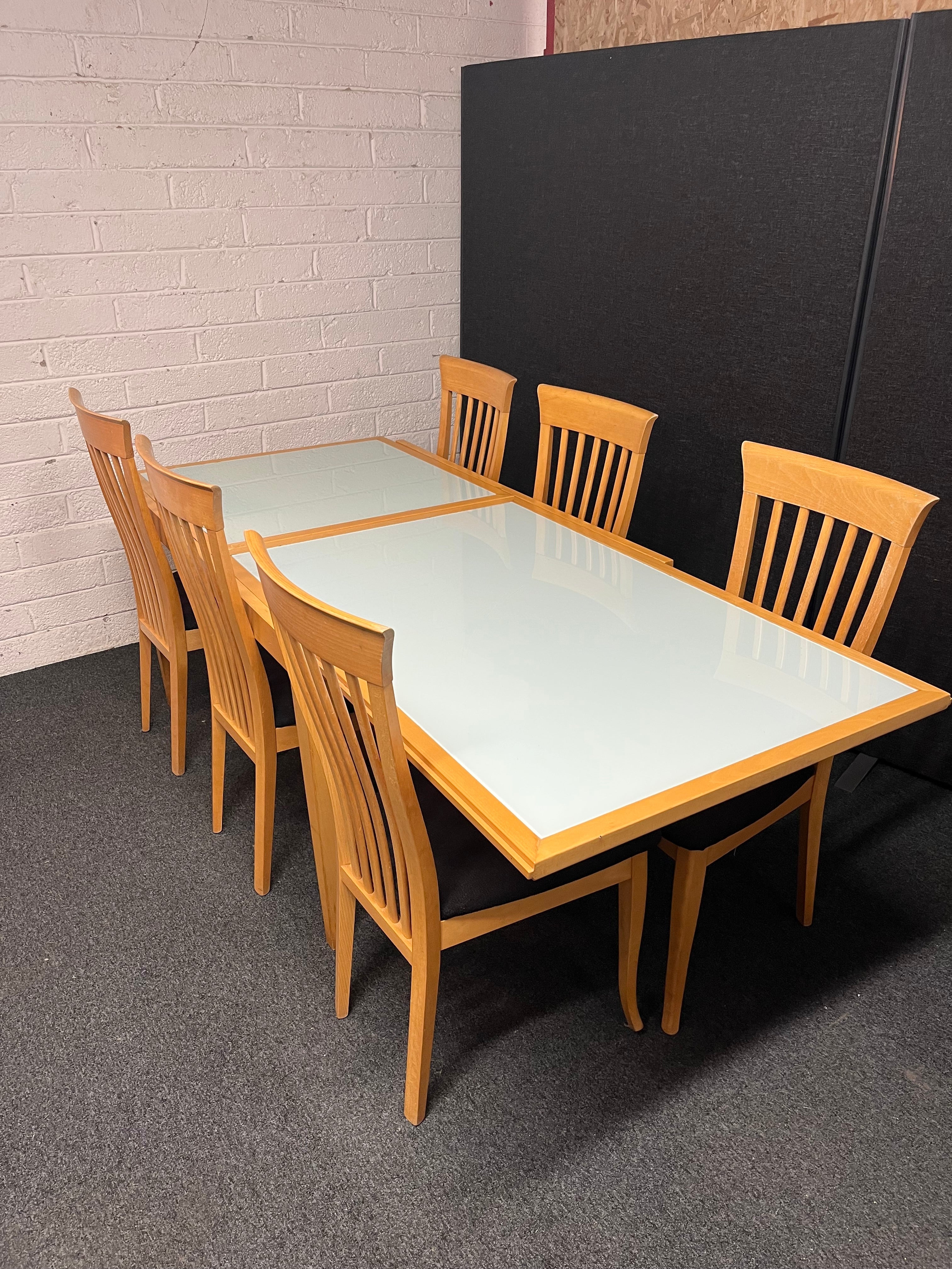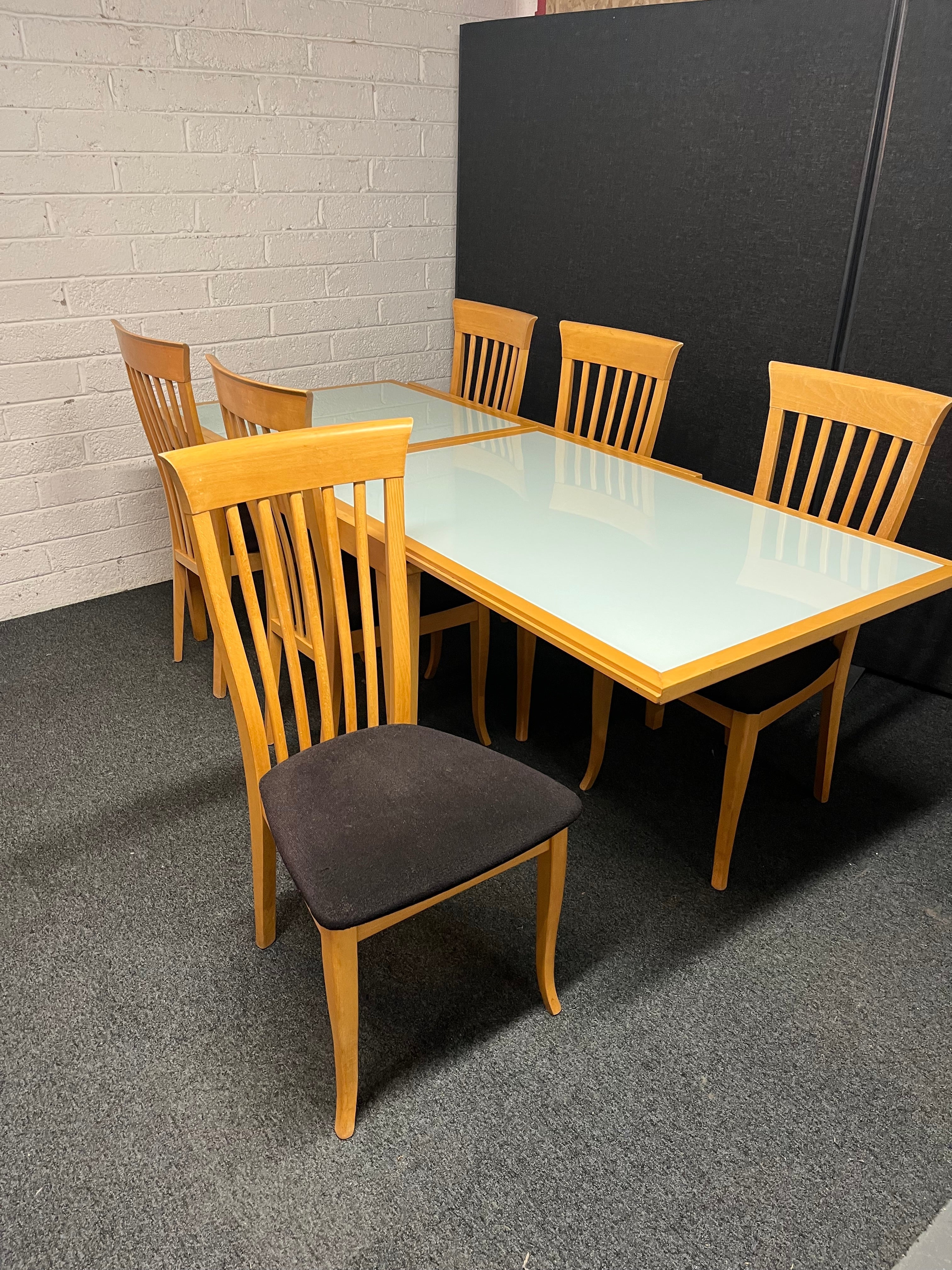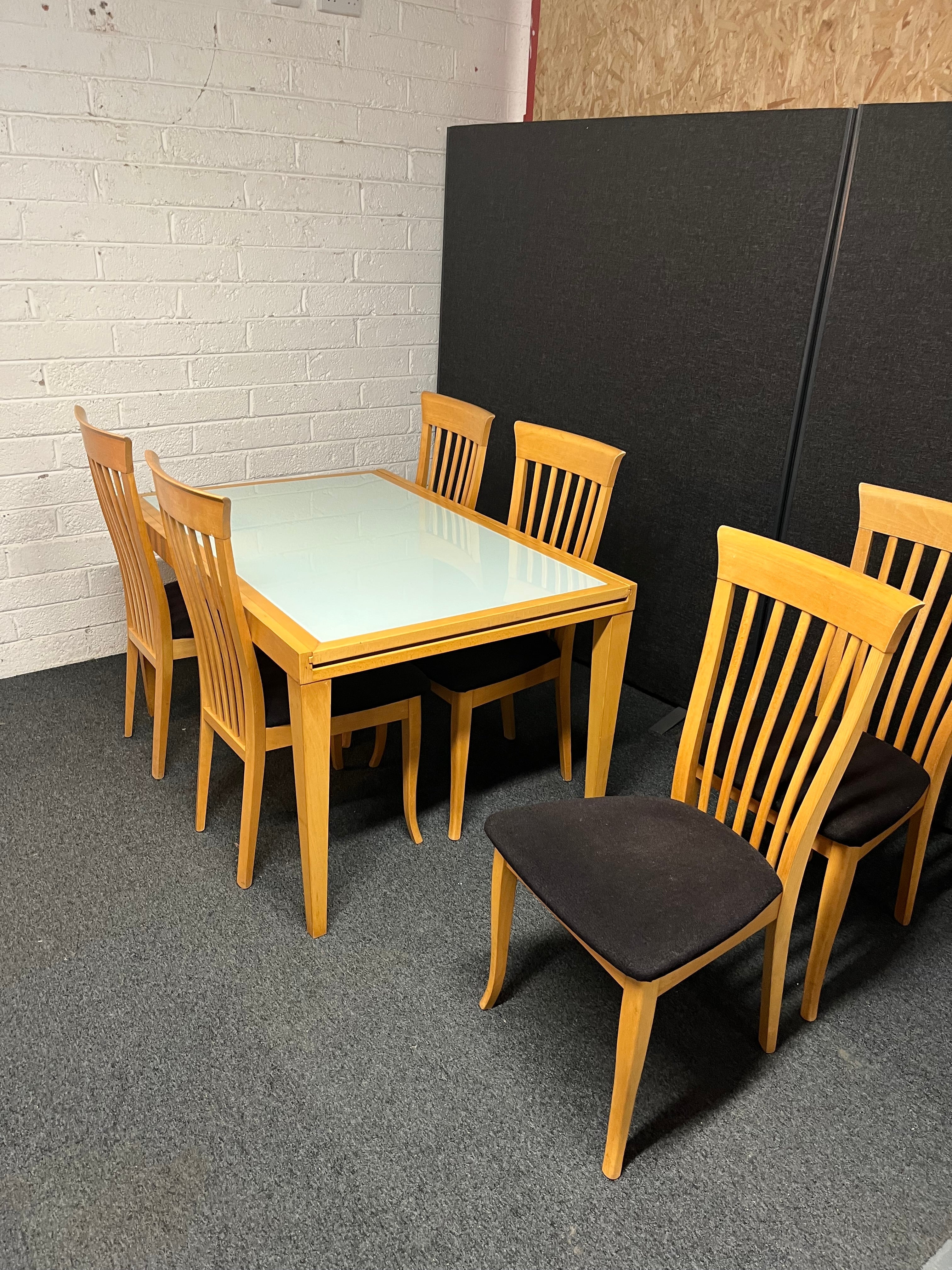 Solid beech and frosted glass extendable dining table with 6 no. matching beech chairs with black seat fabric (L 210 - 130 x W 70) 2225