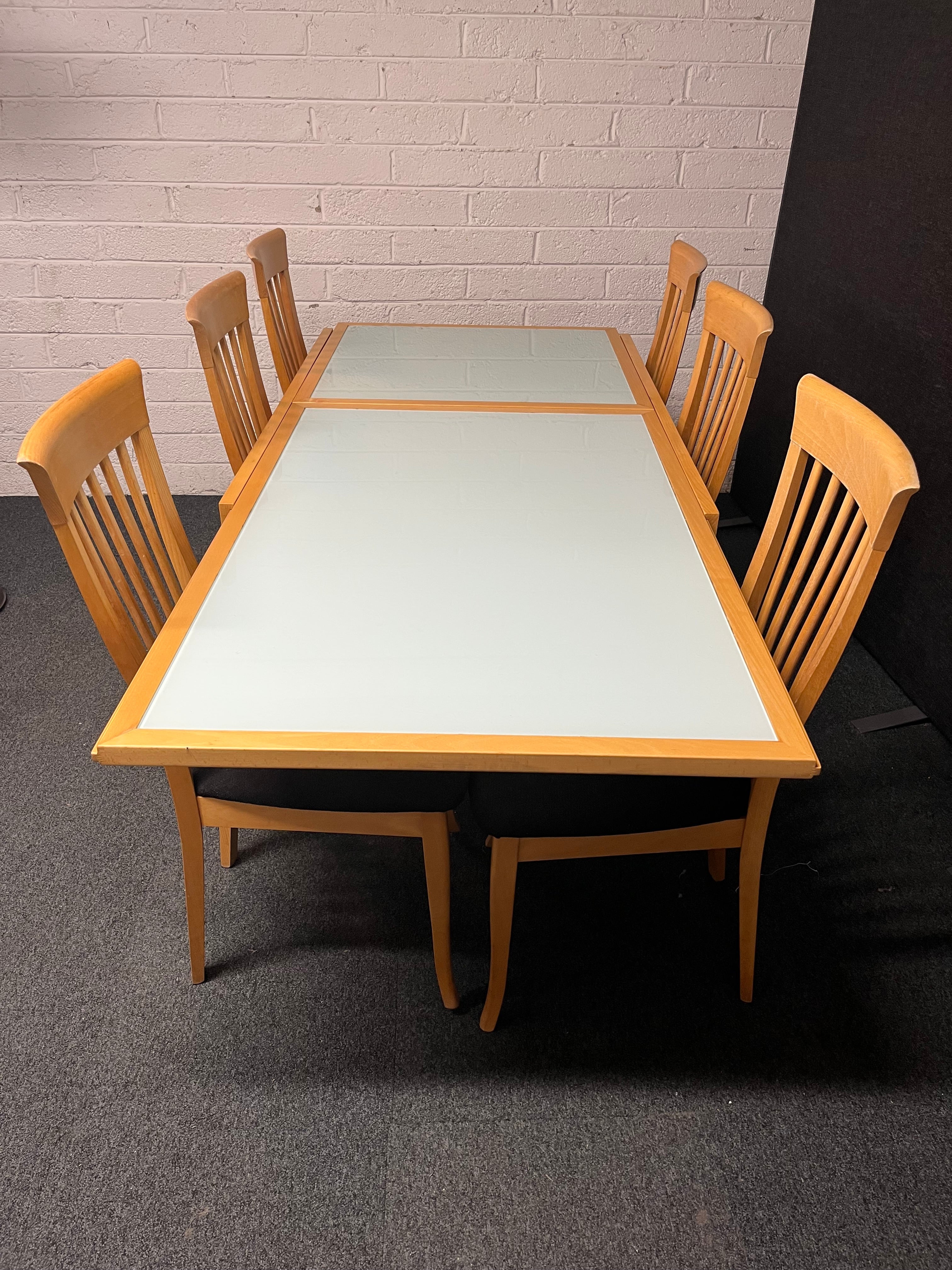 - Share: Solid beech and frosted glass extendable dining table with 6 no. matching beech chairs with black seat fabric (L 210 - 130 x W 70) 2225