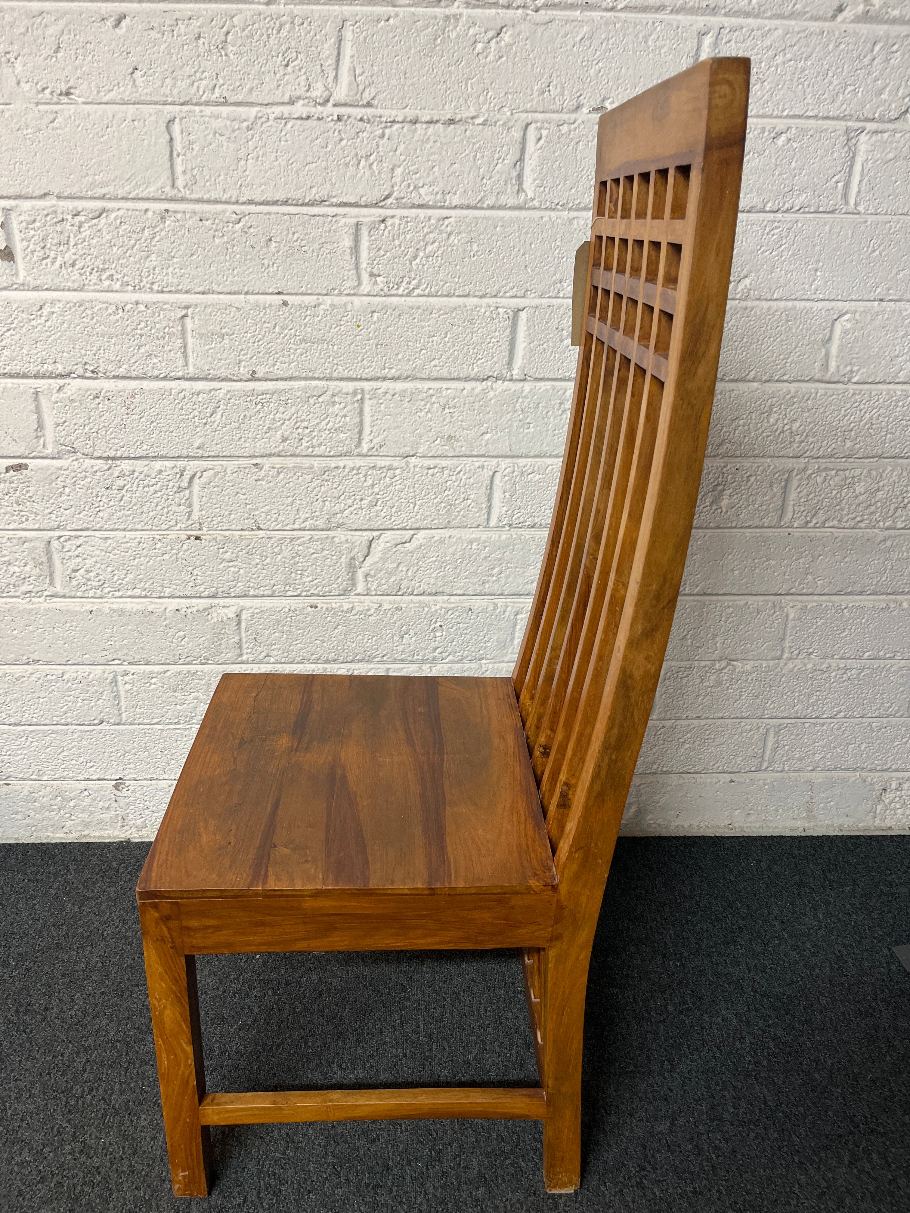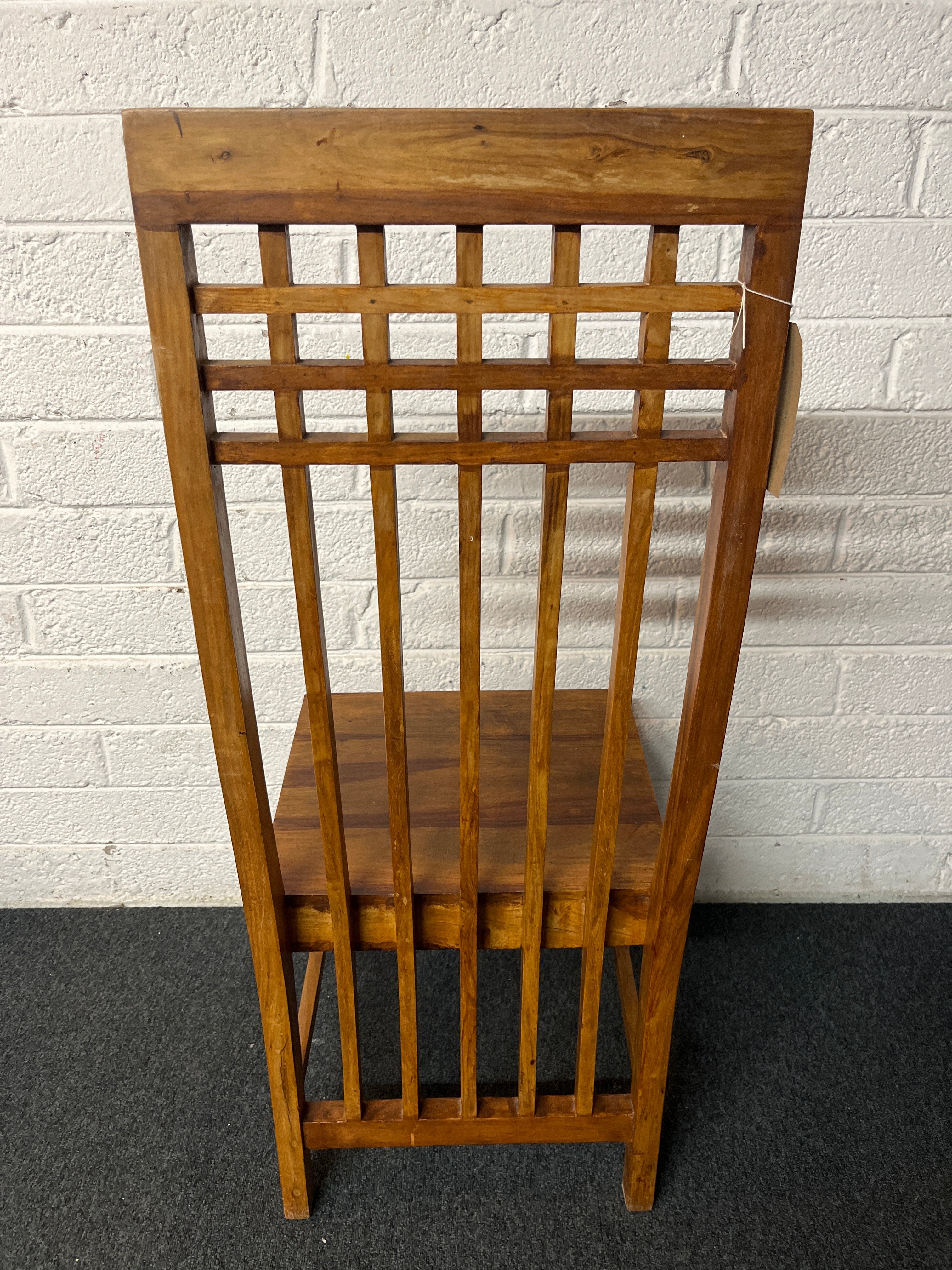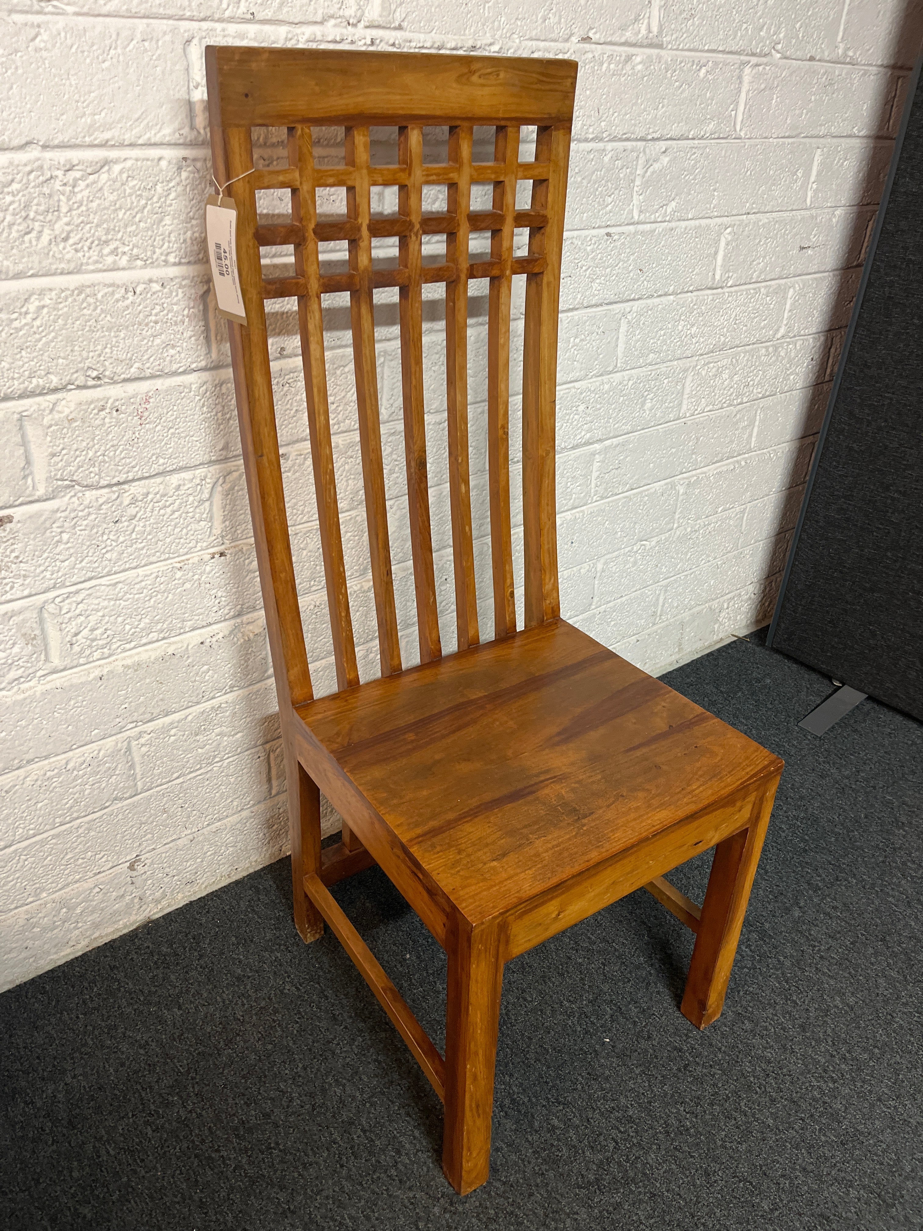 Solid dark teak wood stained high lattice back dining chair with wooden seat