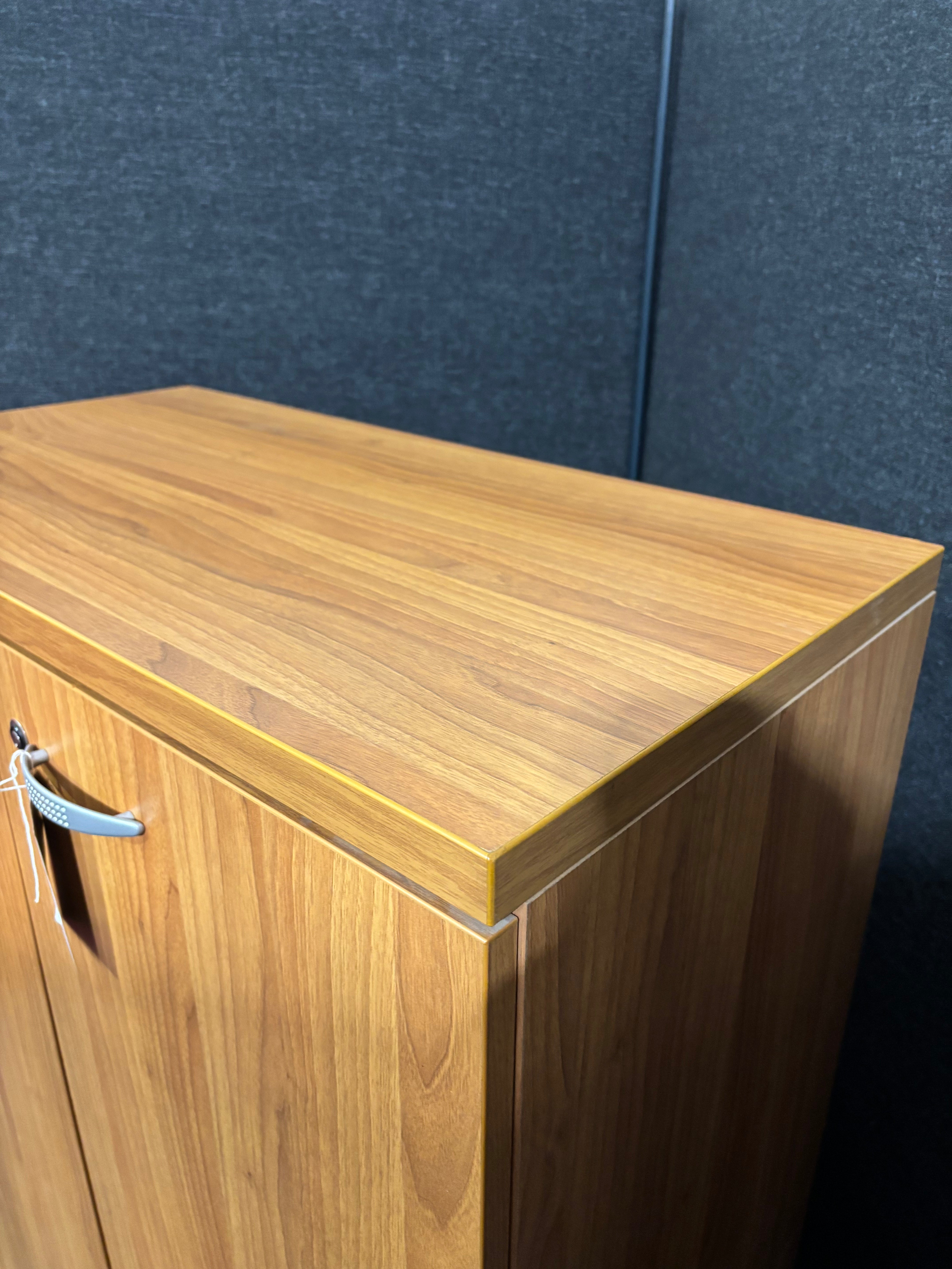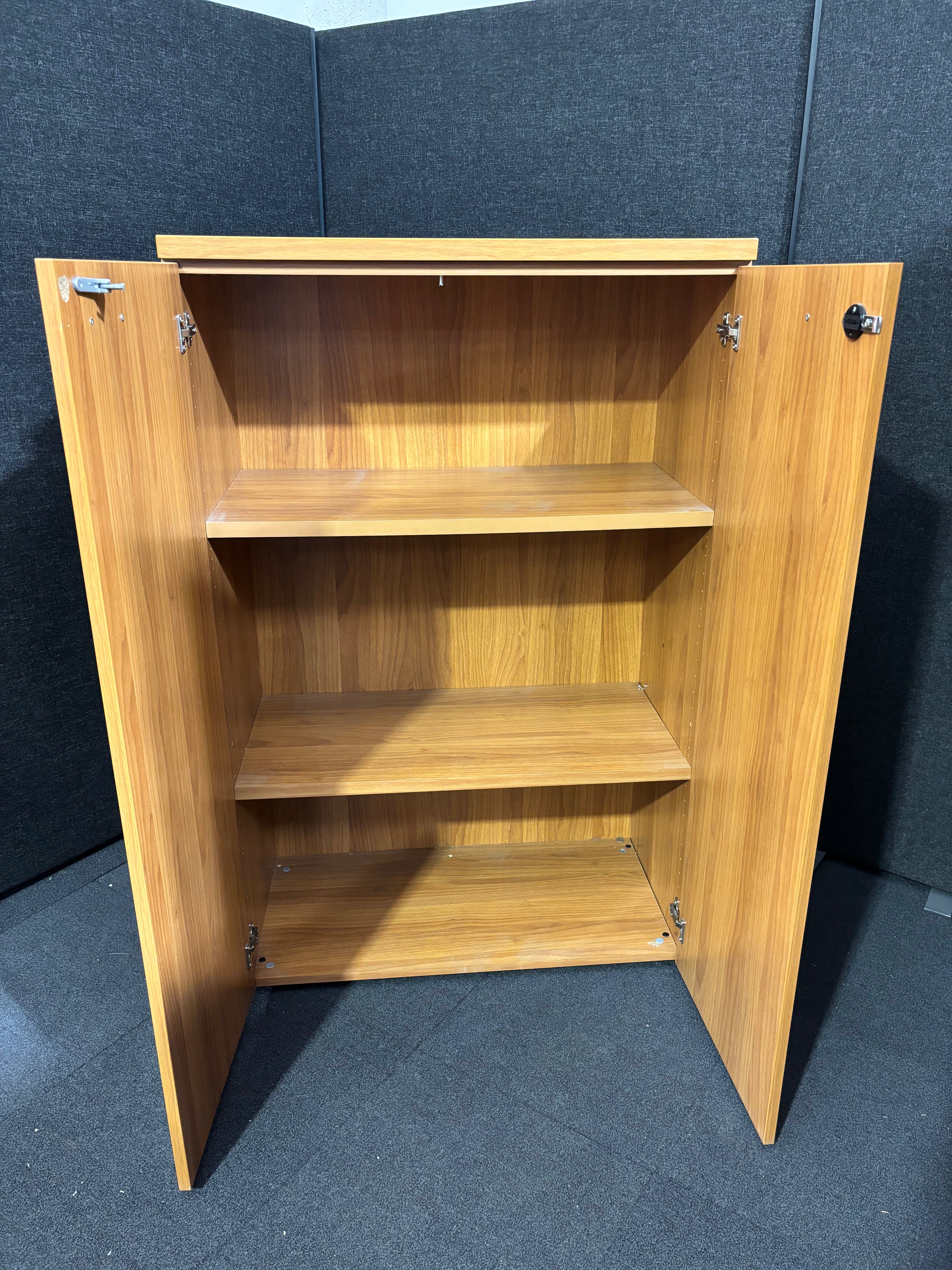 Tall cherry laminate 2 door storage unit with internal shelves 1310Hx860Wx450D