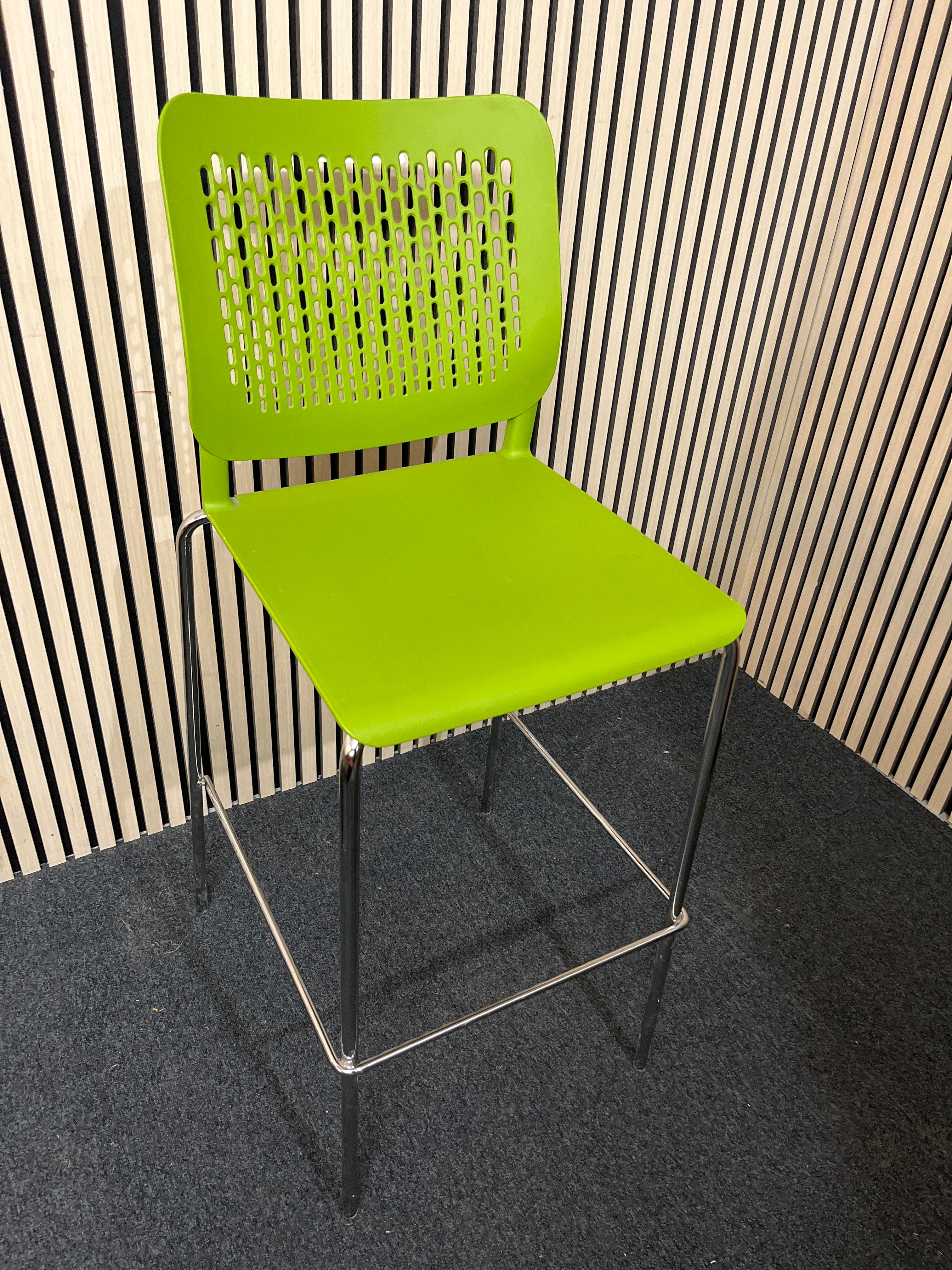 Tall chrome framed cafe stool with foot support and with polyprop lime green seat and back