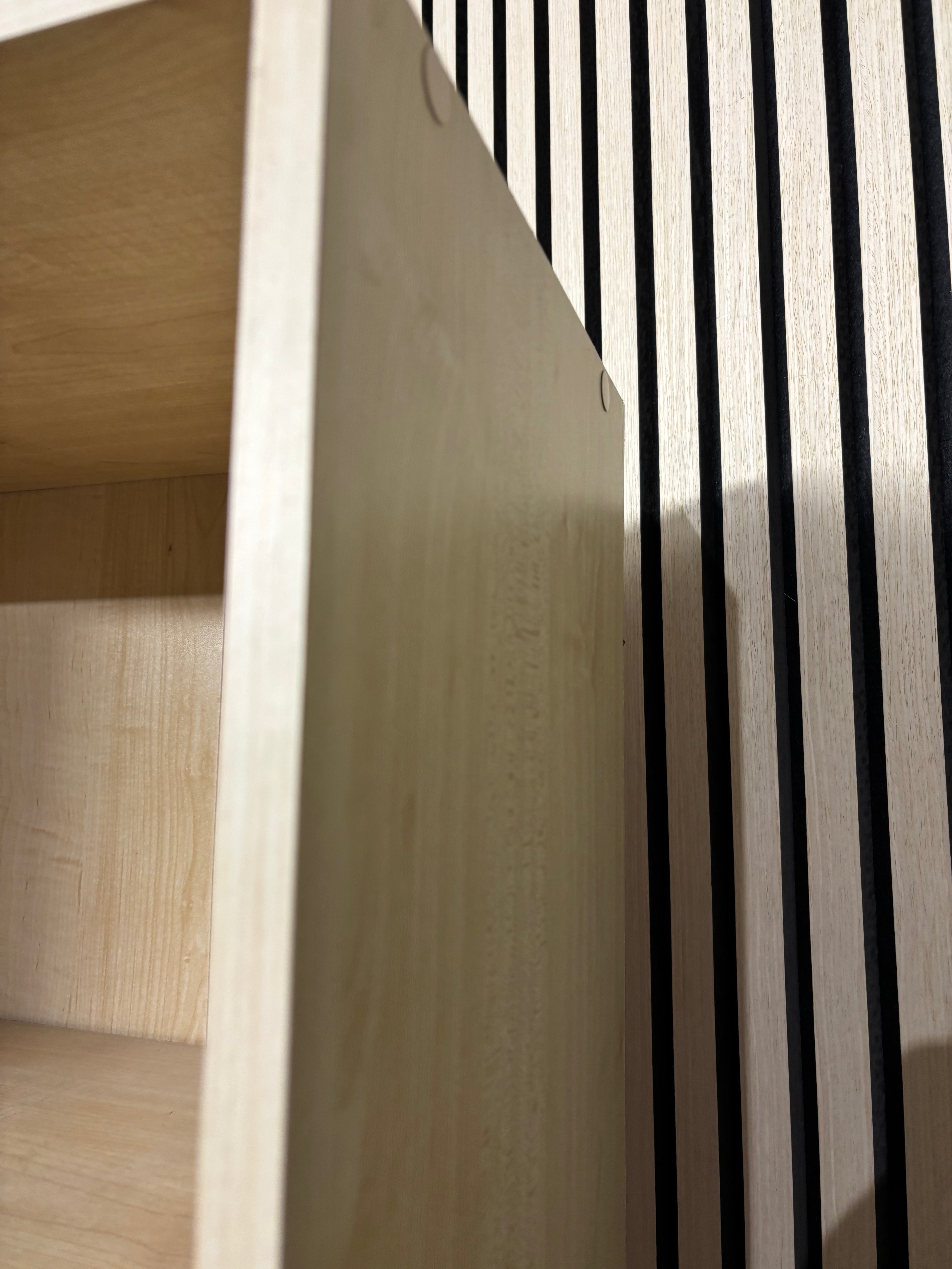 Tall light maple wood narrow shelving unit with open shelves 180Hx30Dx42W