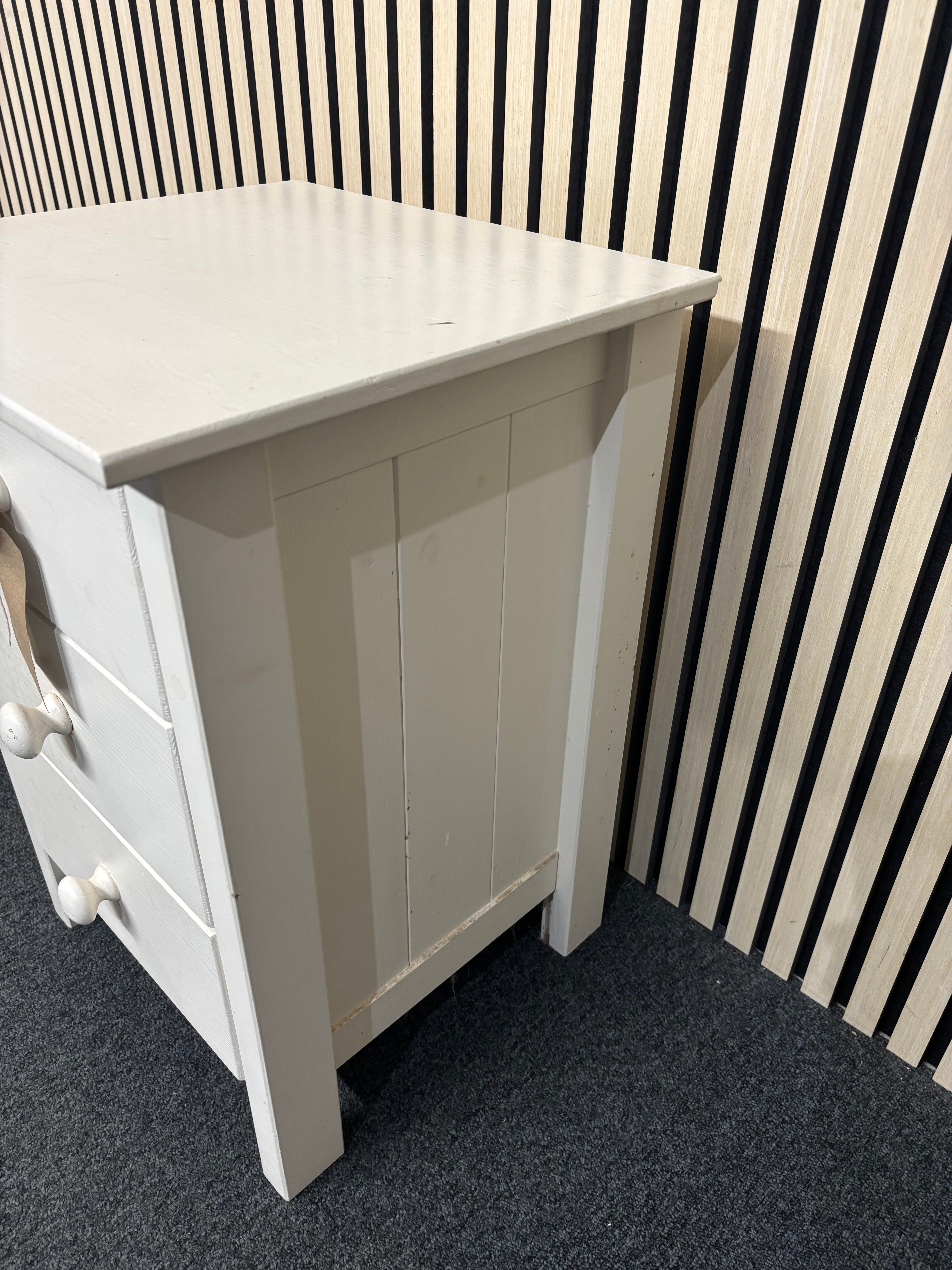 White painted wooden 3 drawer bedside locker with white circular handles (H 60 x W 44 x D 40 cm)